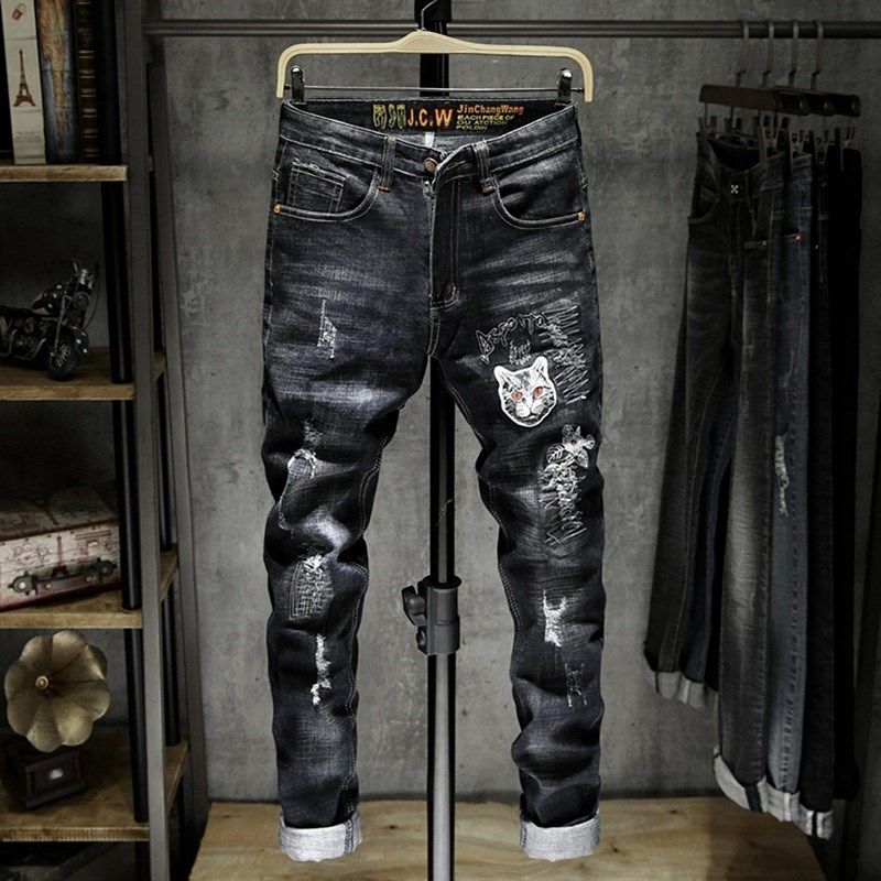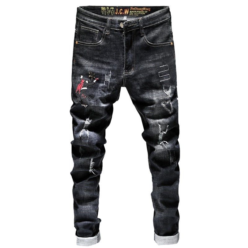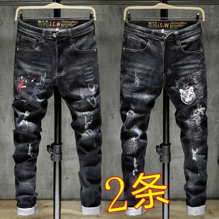 中国风刺绣印花牛仔裤男夏季破洞修身小脚弹力百搭休闲长裤子潮流