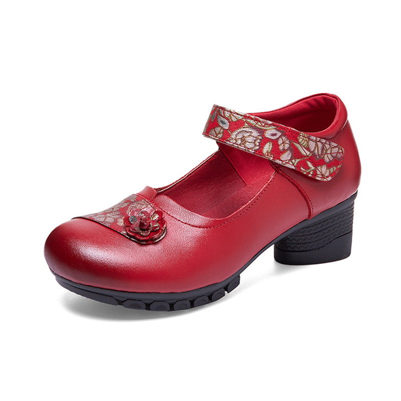 春秋新款原创复古民族风女鞋圆头浅口粗跟单鞋真皮防滑中跟妈妈鞋