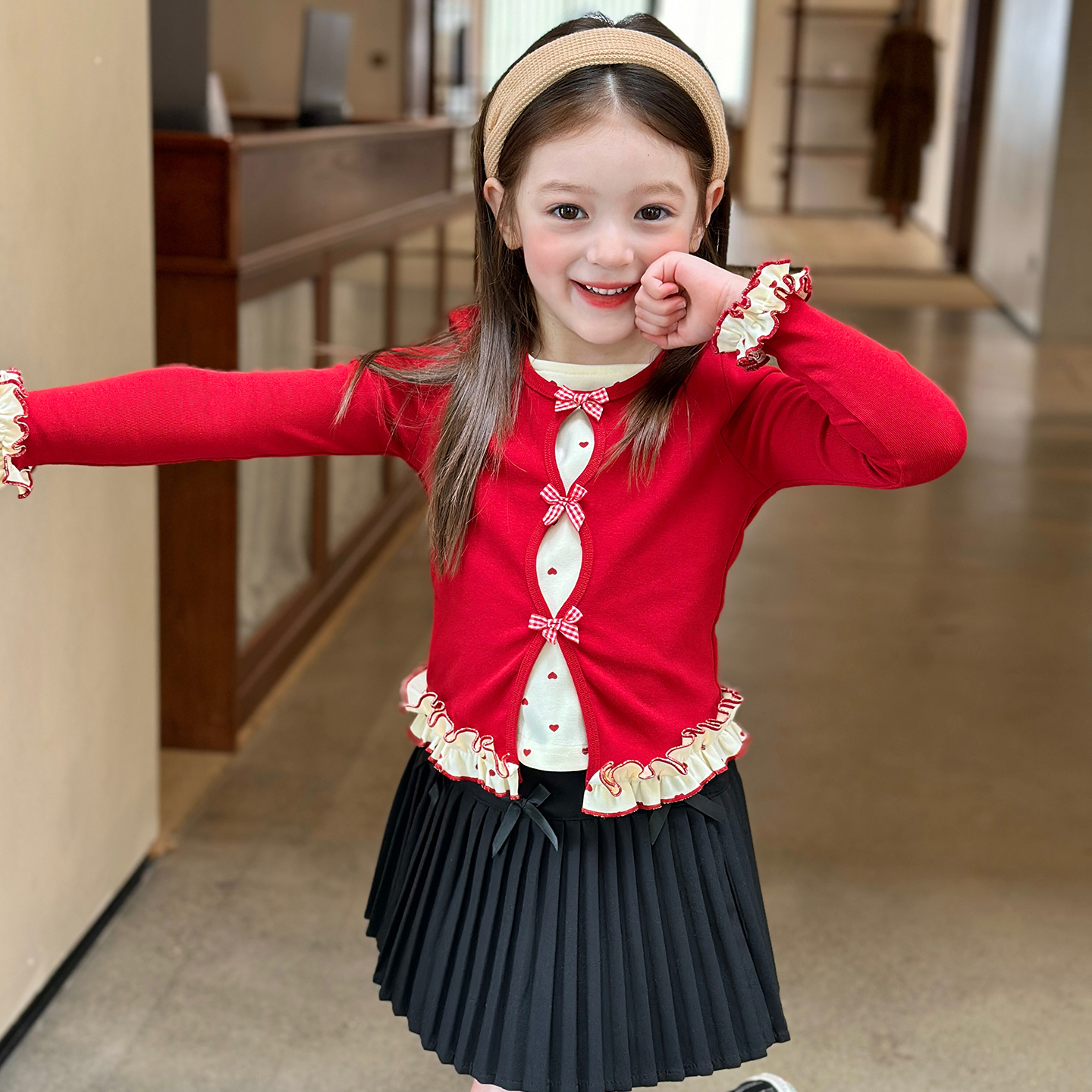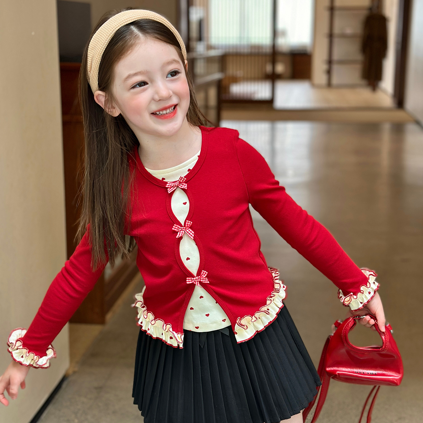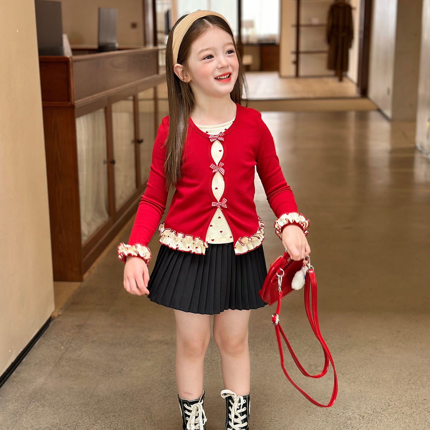 栀了成长记女童装红色假两件上衣2025秋季新款儿童蝴蝶结爱心T恤