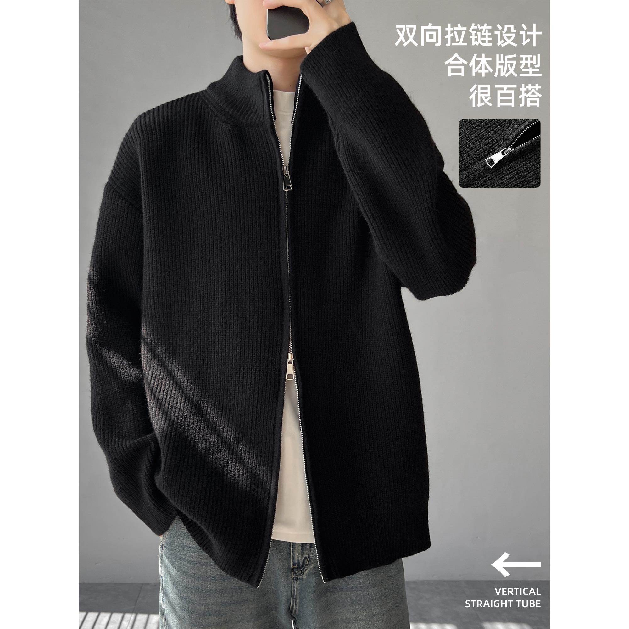 立领开衫毛衣外套男秋季新款休闲潮流男士双开拉链针织夹克衫