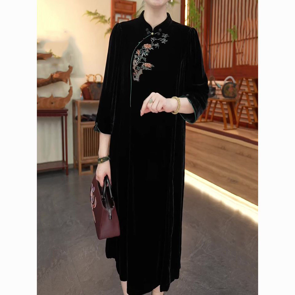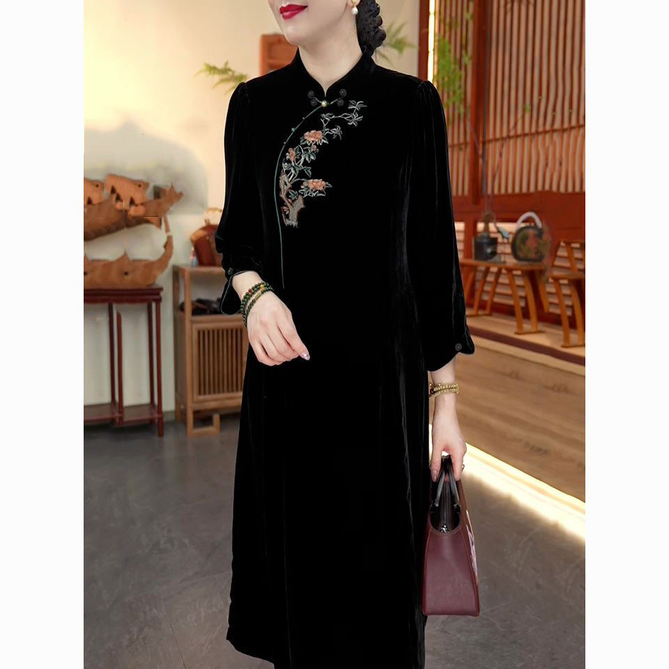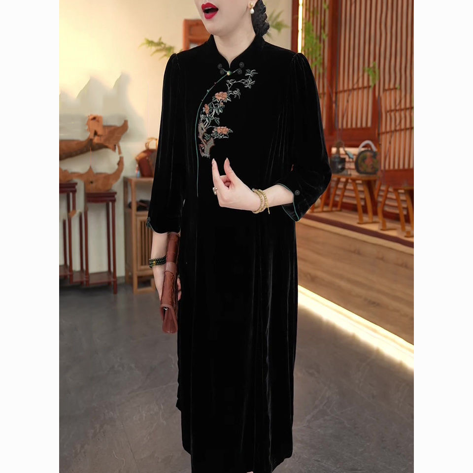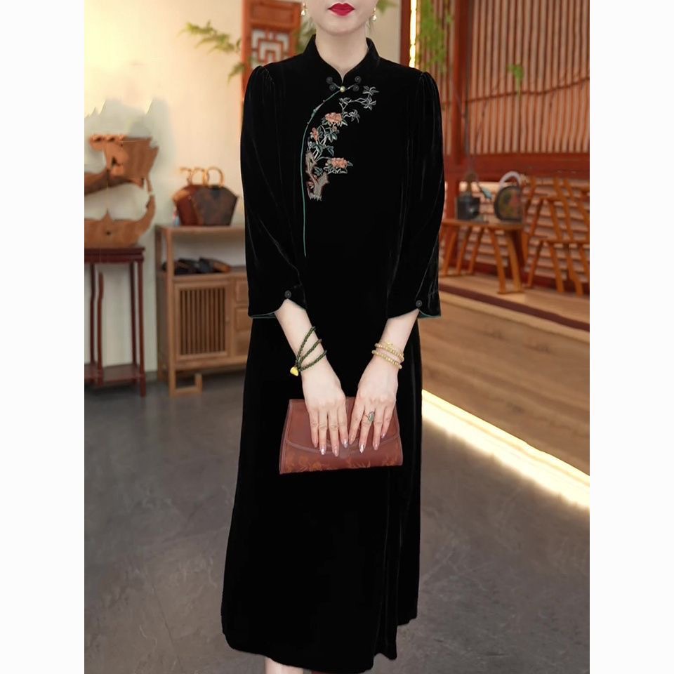 妈妈秋装金丝绒改良旗袍裙绣花喜婆婆结婚礼服婚宴复古高端连衣裙