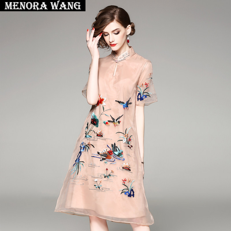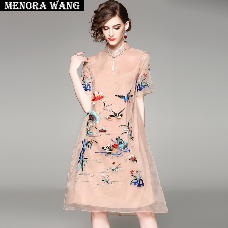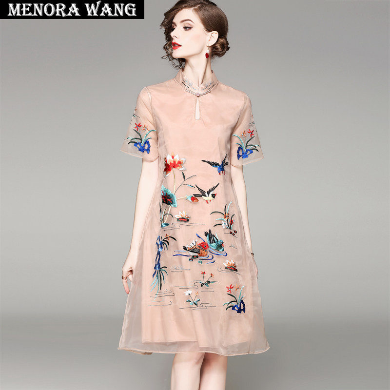 复古民族风刺绣欧根纱a字裙2023年夏季新款妈妈装改良旗袍连衣裙