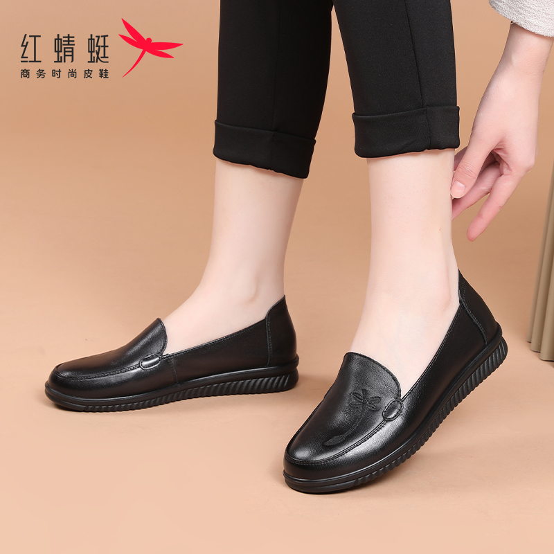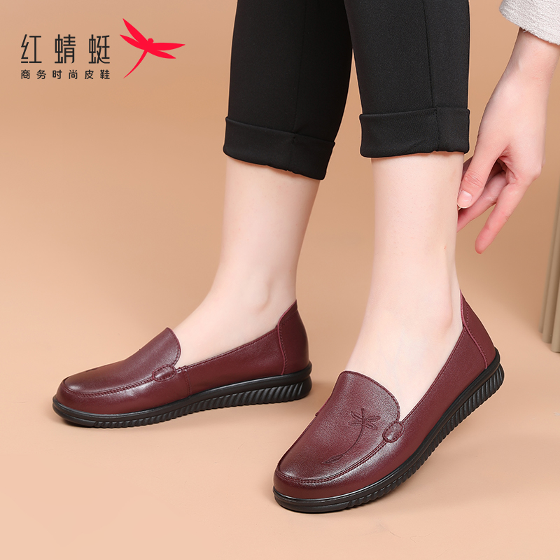 红蜻蜓女鞋秋季鞋子休闲小皮鞋女一脚蹬懒人鞋软皮软底真皮妈妈鞋