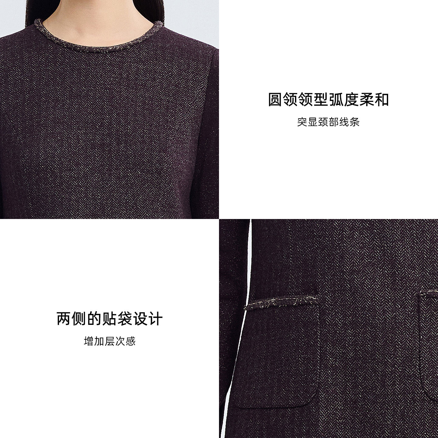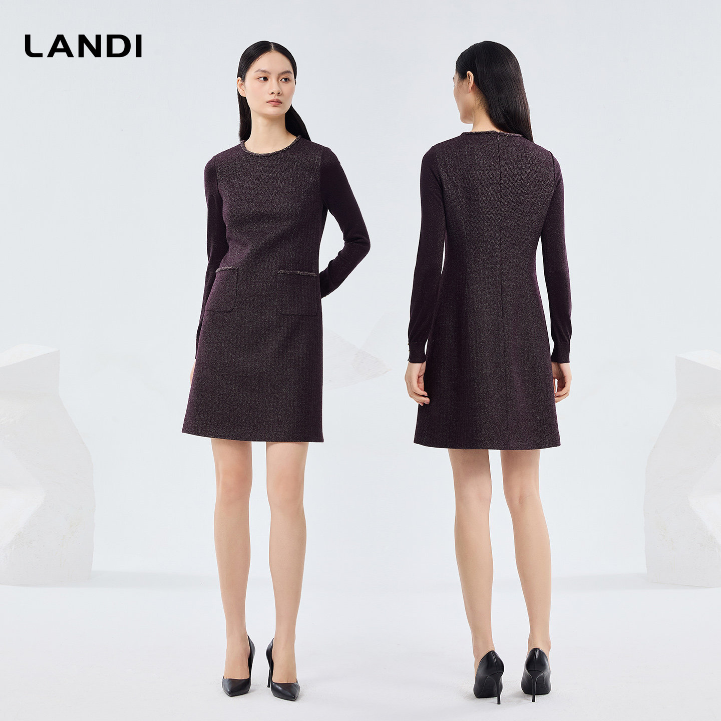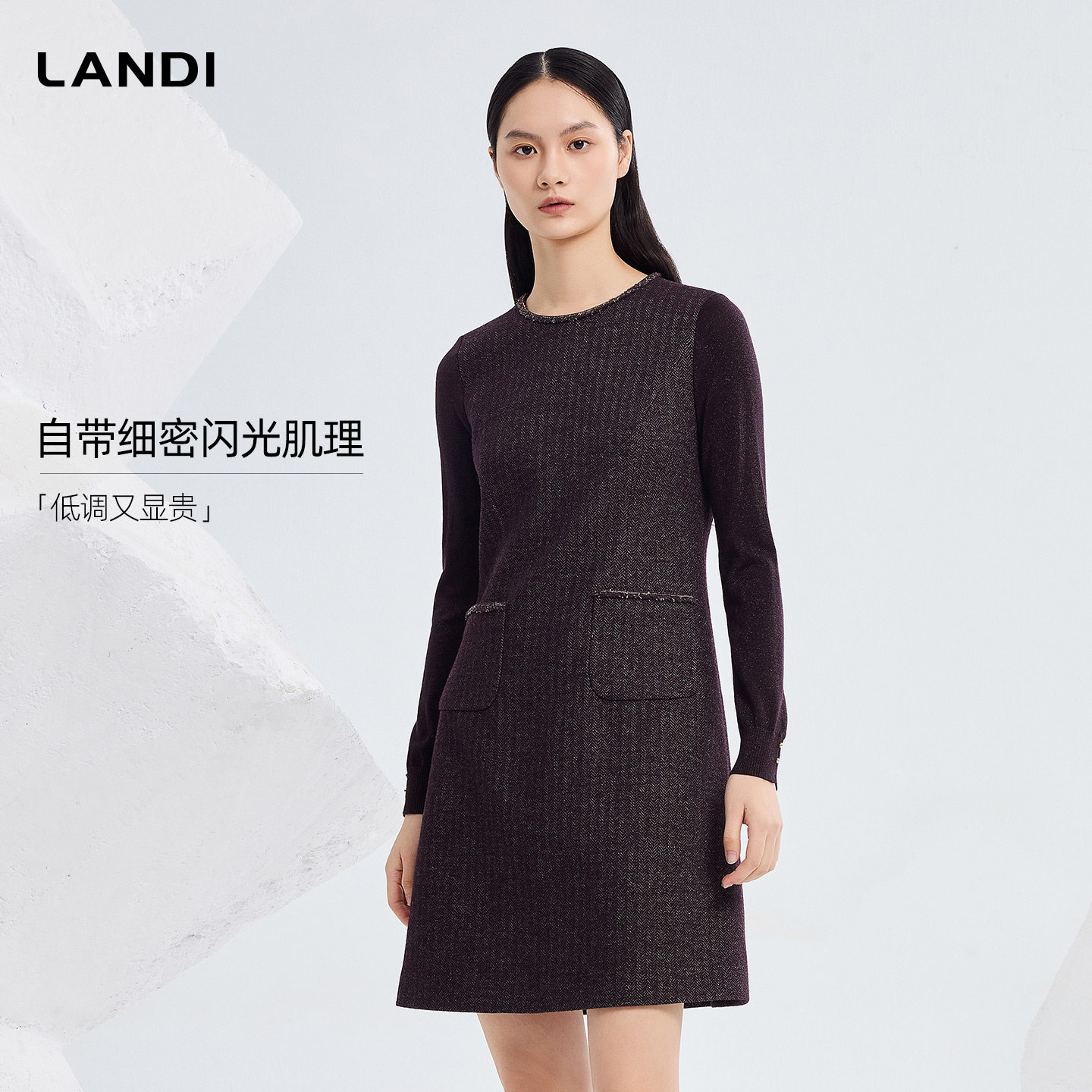 [商场同款]LANDI深酒红色圆领暗纹绵羊毛拼接连衣裙女2026春新品