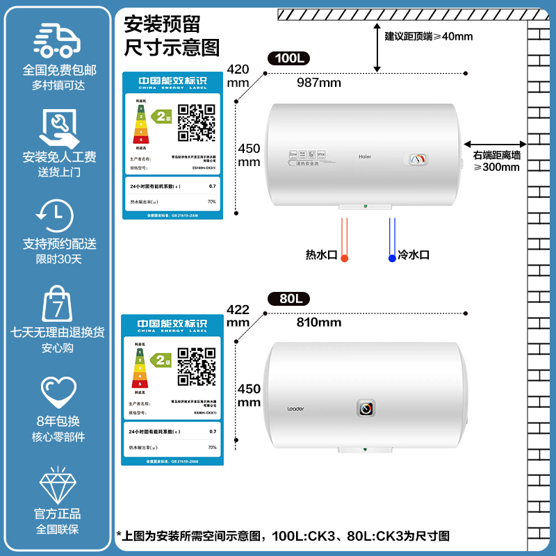 国补海尔电热水器100升家用卫生间租房洗澡50L80L大容量节能CK3