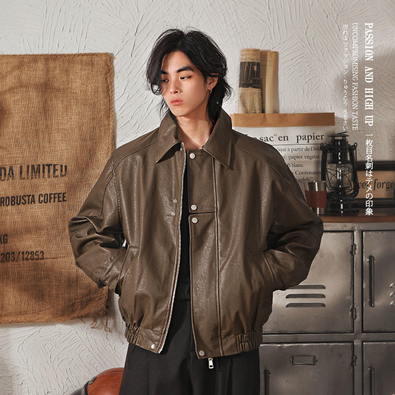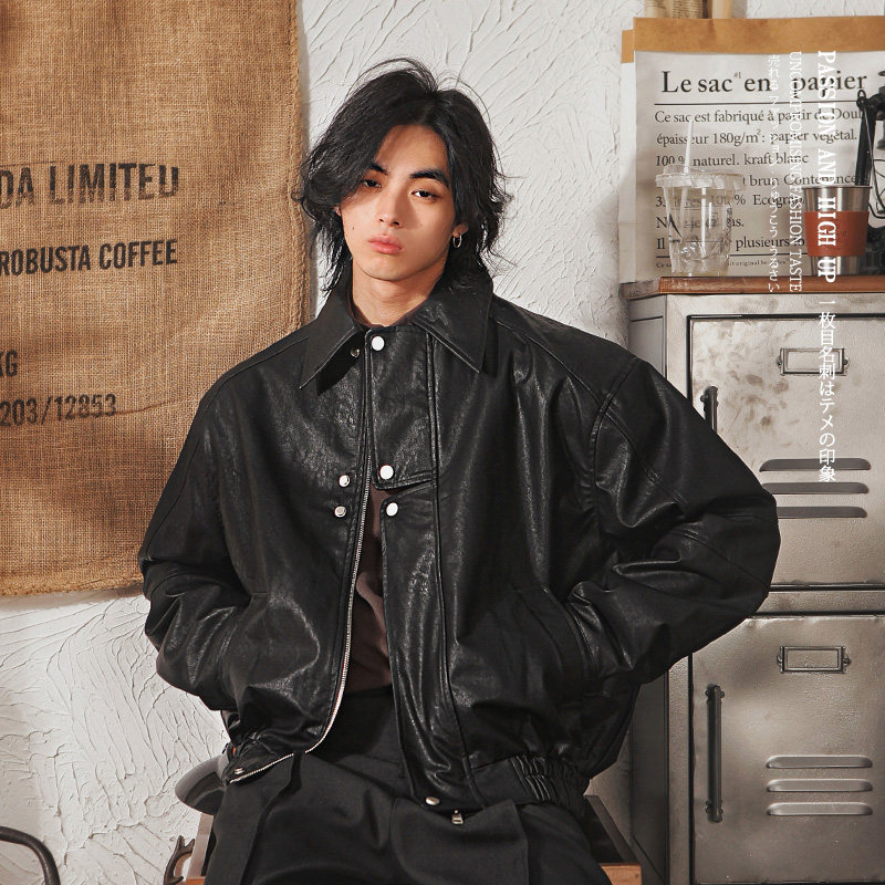 美式复古机车皮衣外套男春秋季2024新款潮牌宽松短款垫肩翻领夹克