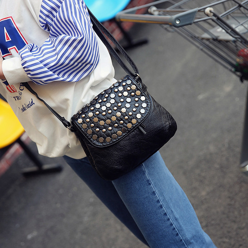 韩版单肩斜挎包水洗皮迷你铆钉女