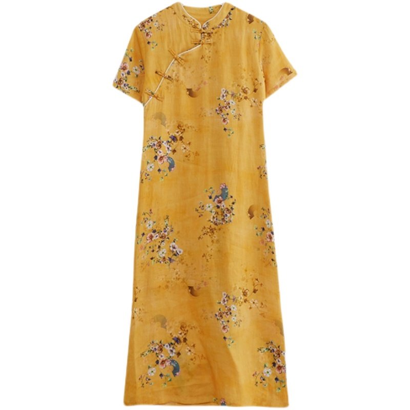 中国风高端苎麻连衣裙女夏季中式国风印花改良旗袍禅意茶服a字裙