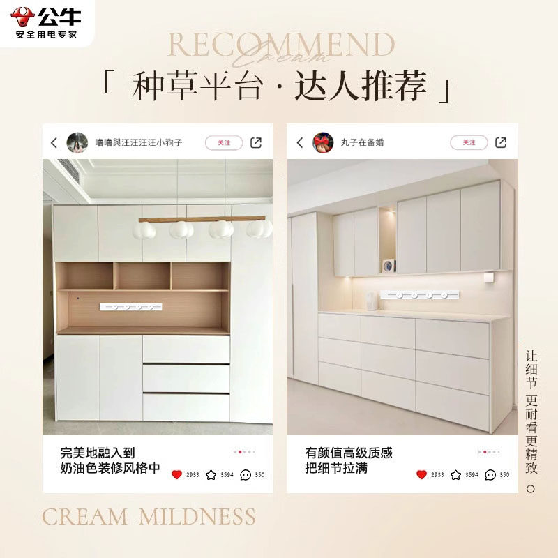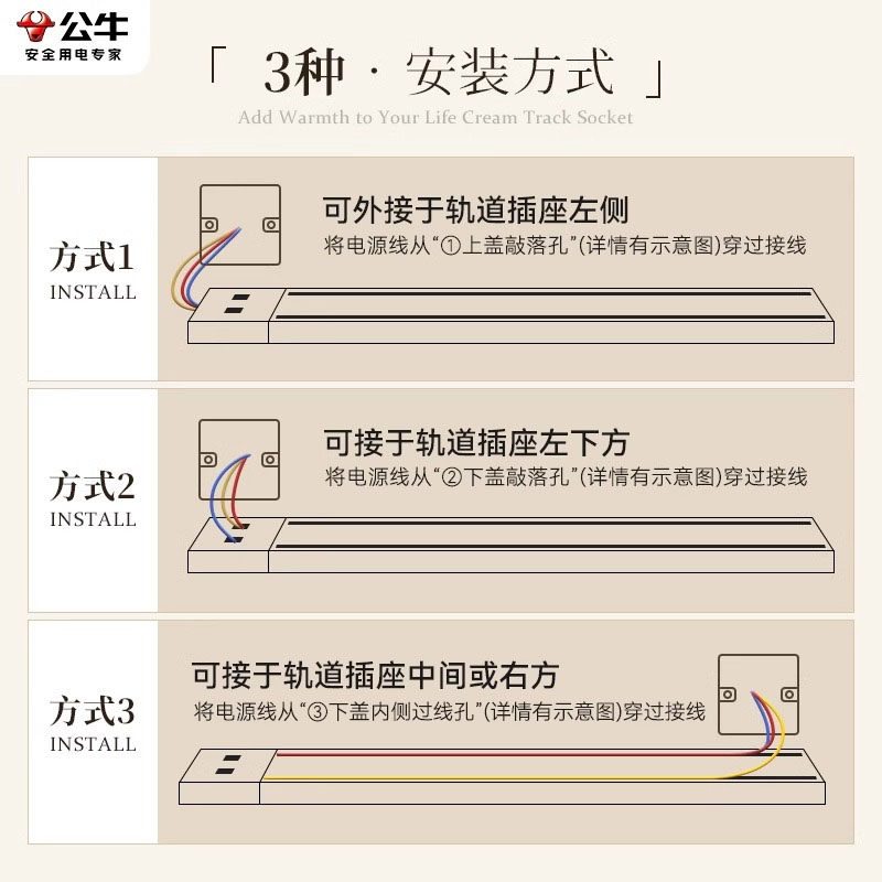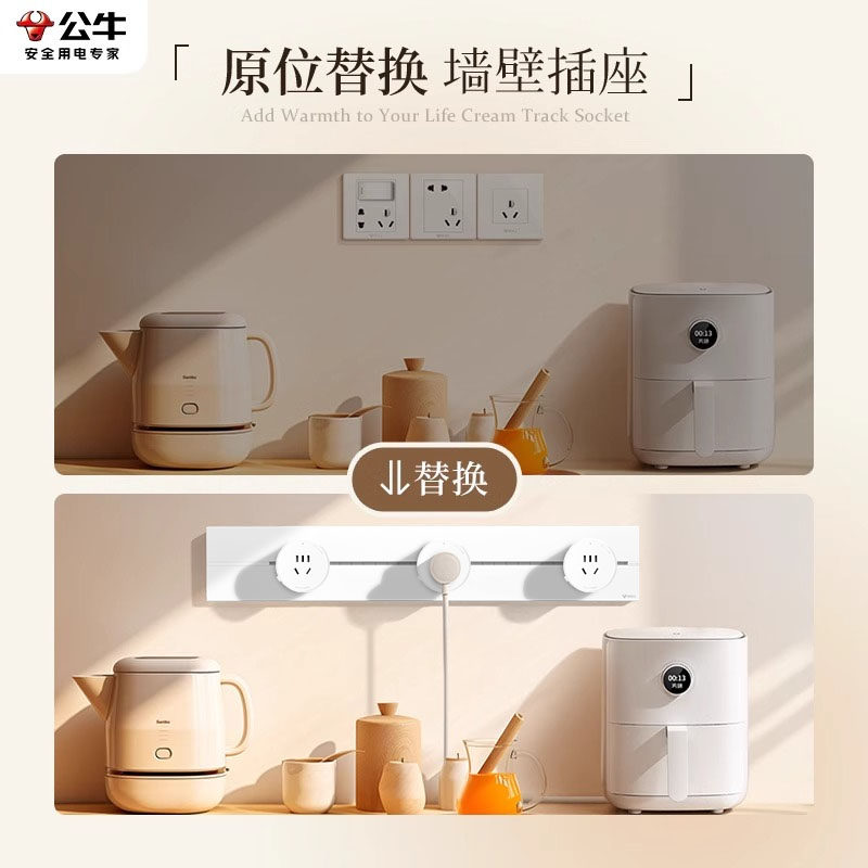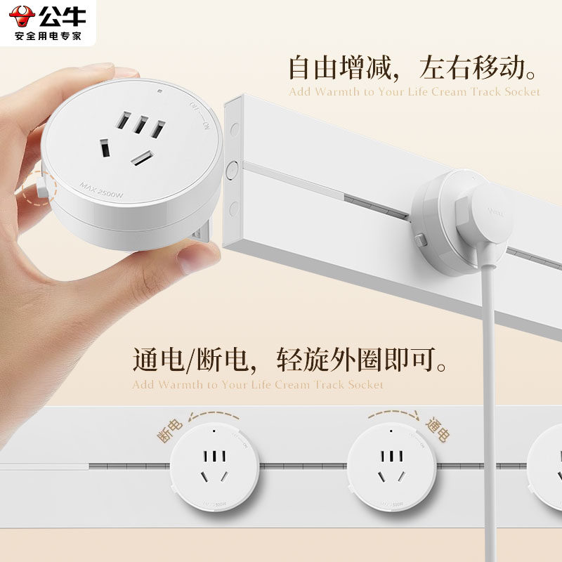 公牛奶油白轨道插座官方正品明装家用餐边柜磁吸滑动电力导轨插排
