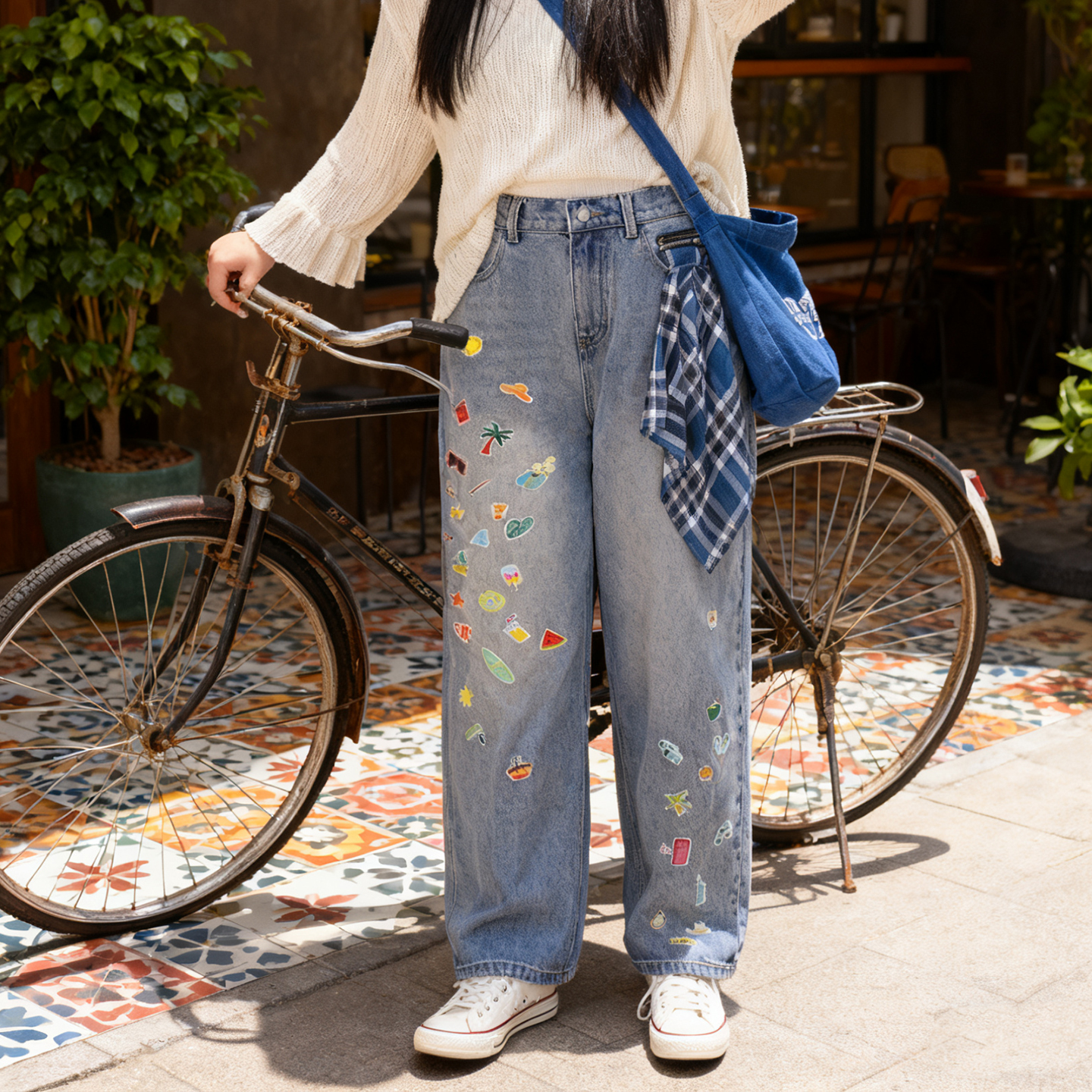 300斤大码女装胖mm美式卡通贴纸印花牛仔裤女宽松阔腿复古直筒裤
