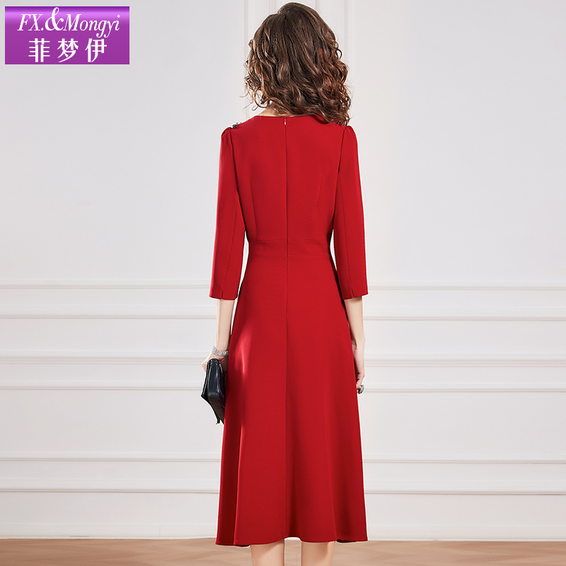 菲梦伊钉珠红色连衣裙女秋季新款本命年高级感收腰气质中长款裙子