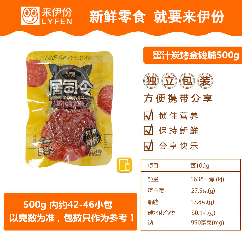 来伊份蜜汁炭烤金钱脯500g猪肉脯肉干高蛋白解馋网红休闲零食小吃