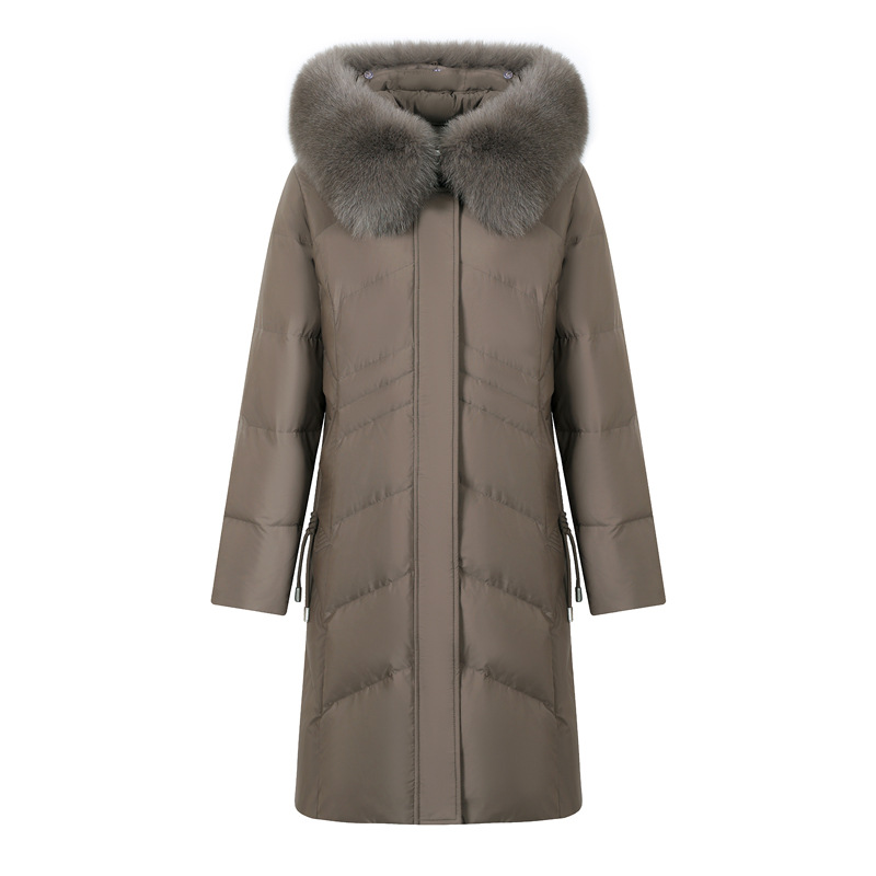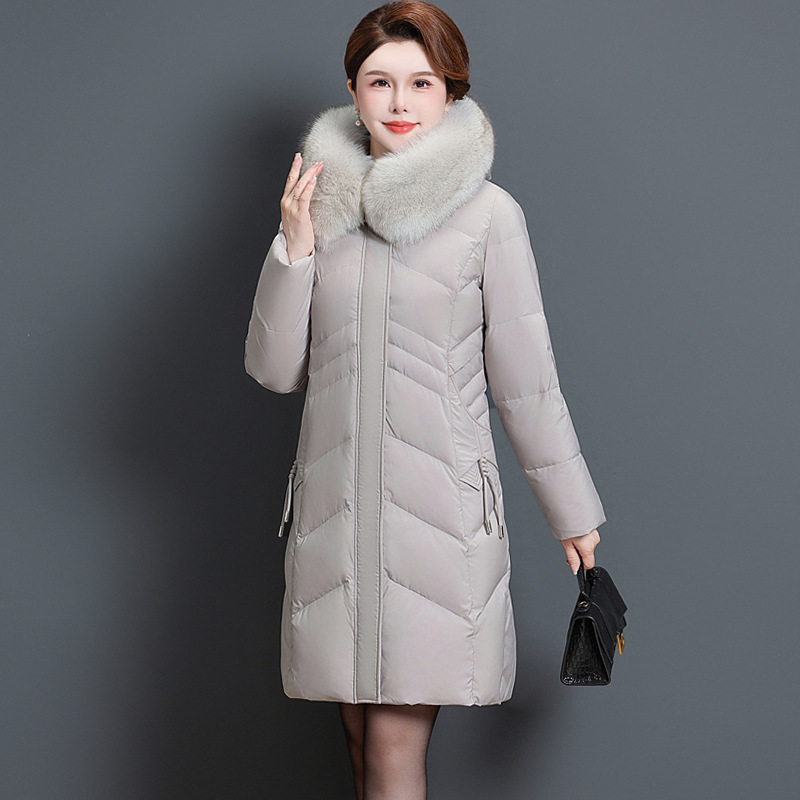 妈妈中长款羽绒服女冬装新款中老年女士洋气连帽毛领加厚鸭绒外套