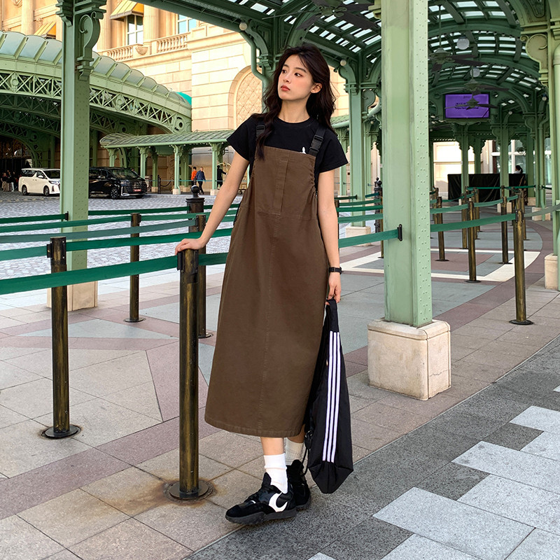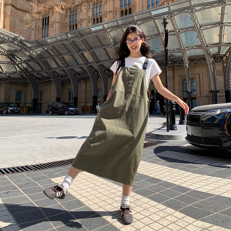 PSO Brand女装全棉双斜工装长裙春夏季可调节背带裙休闲裙子