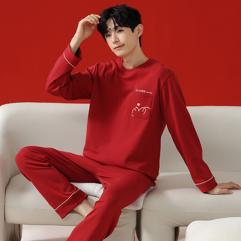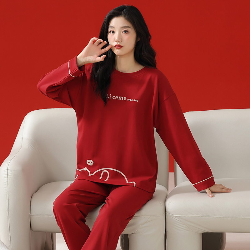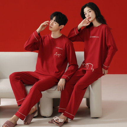 纯棉情侣红色睡衣女款春秋季长袖长裤新娘结婚家居服男士大码套装