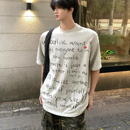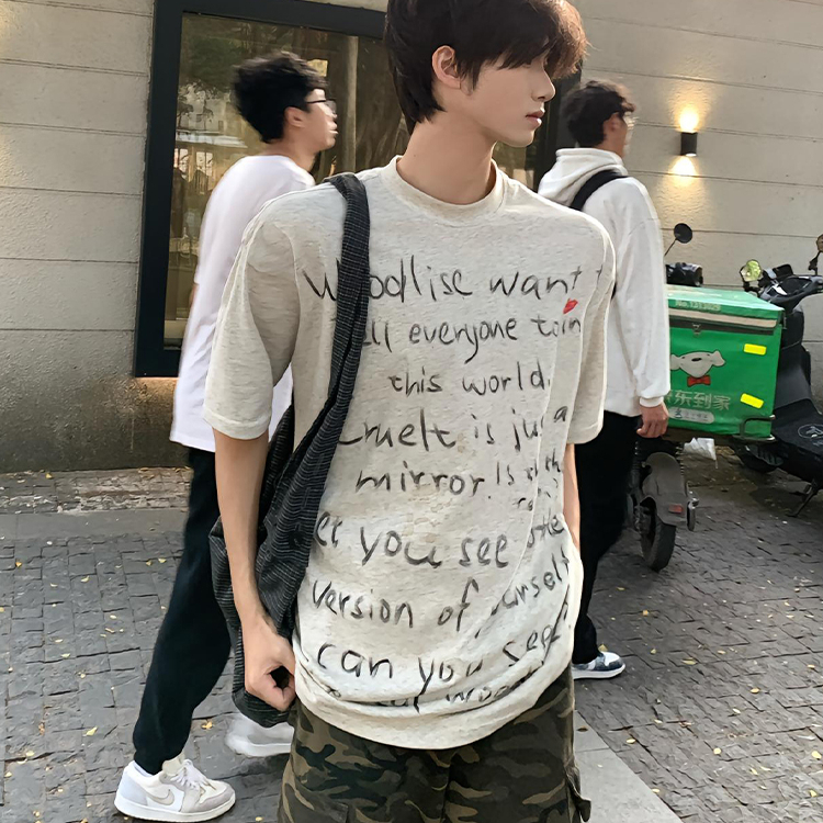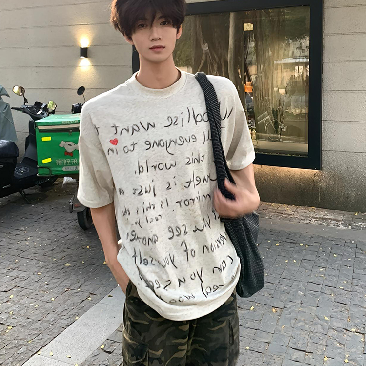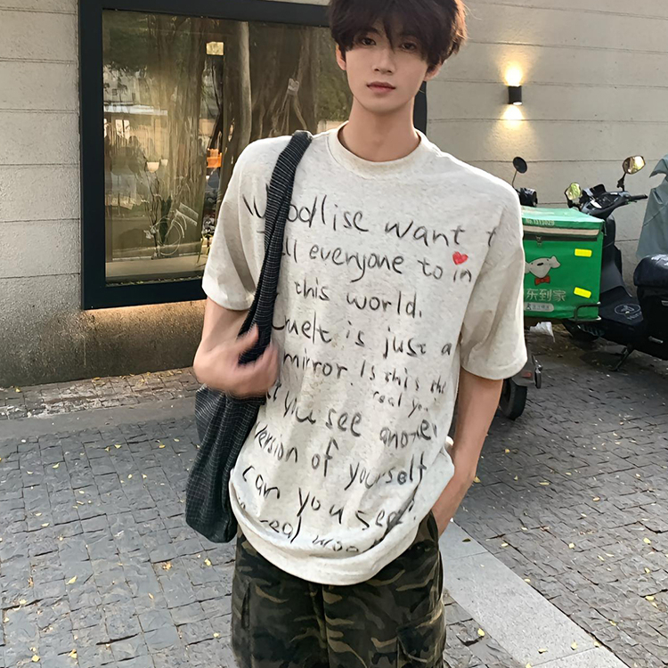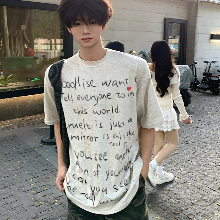 美式复古涂鸦手绘字母短袖t恤男