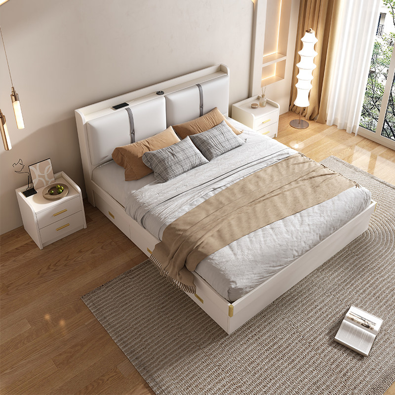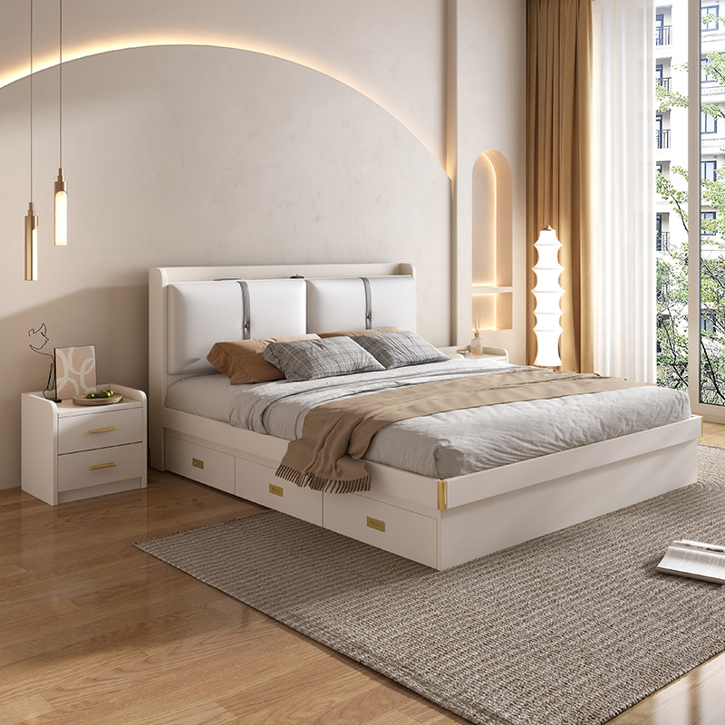 奶油风全实木床简约现代双人主卧室高箱储物床板抽屉白色软靠包床