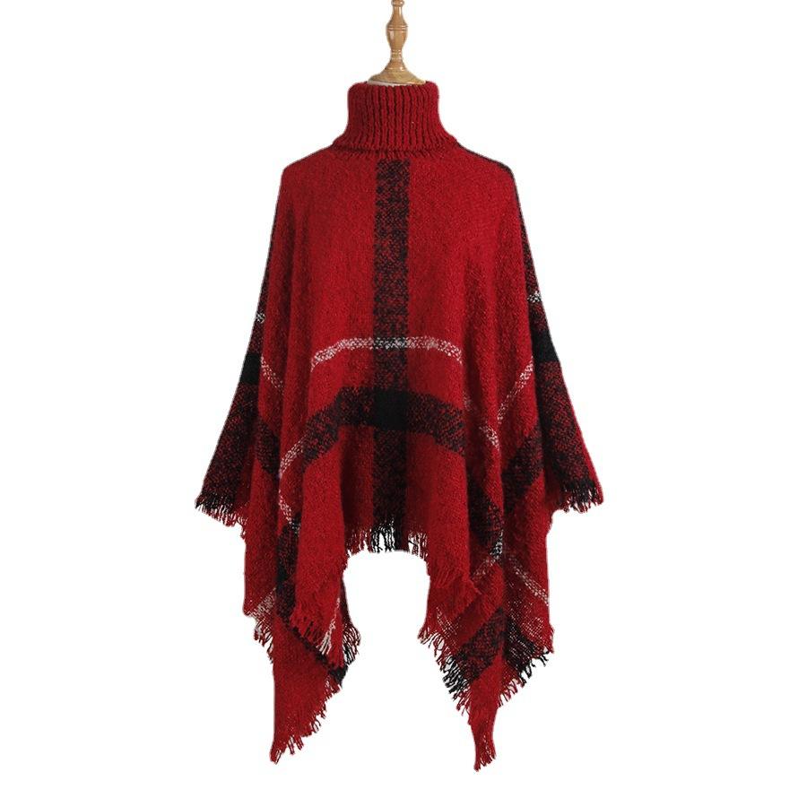 2025速卖通毛衣女欧美秋冬中长款高领流苏斗篷披肩撞色宽松针织衫