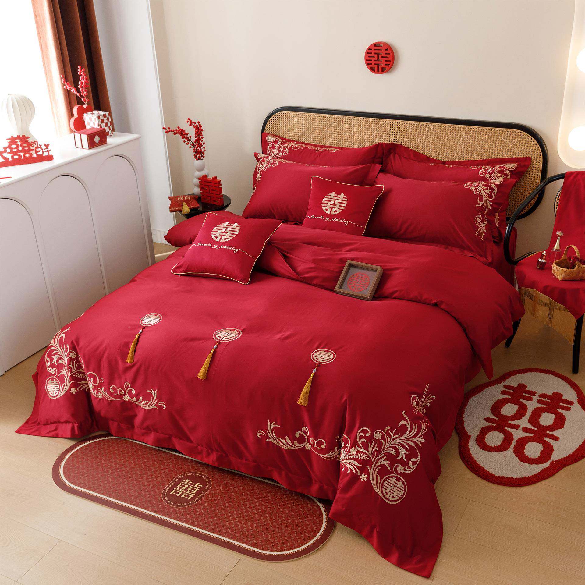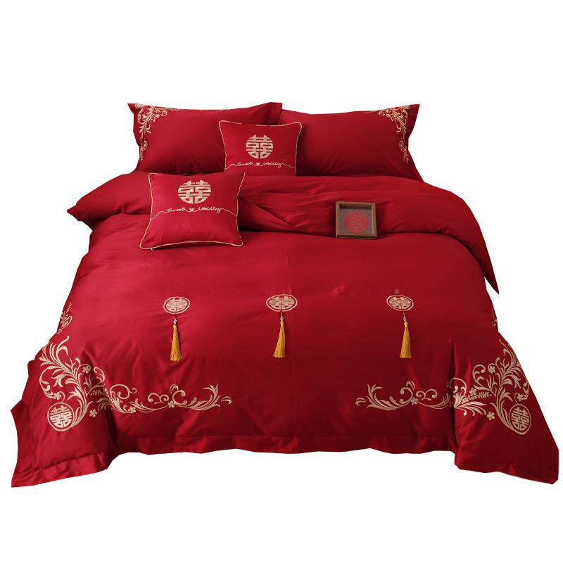 被简约中式婚庆四套100SFS757010长绒棉红件色字刺绣喜结婚套床单
