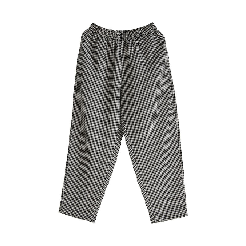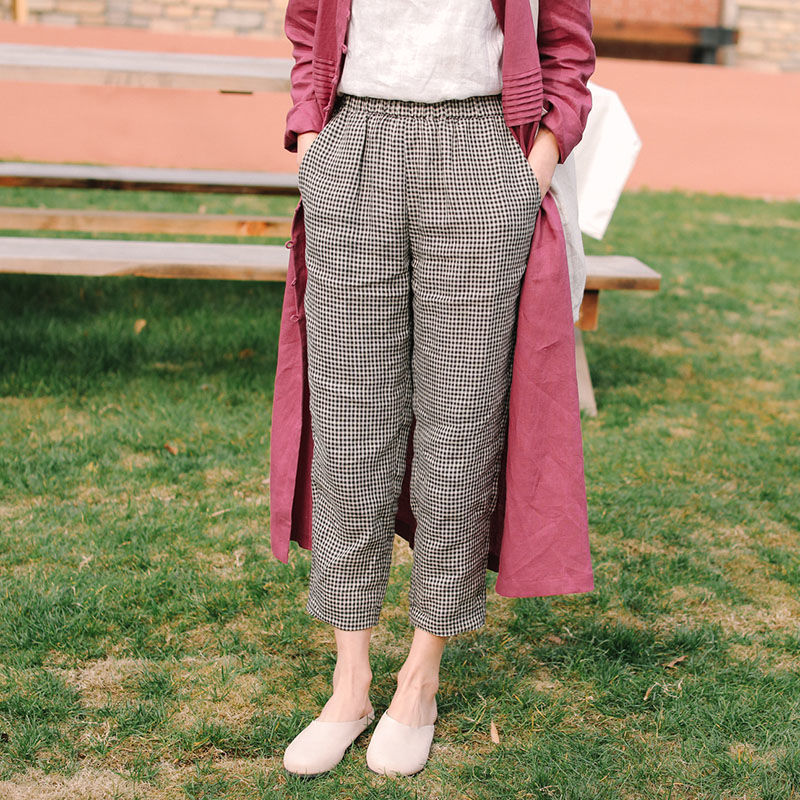 亚麻格子九分裤女春秋新款原创棉麻松紧腰女裤黑白休闲百搭裤子潮