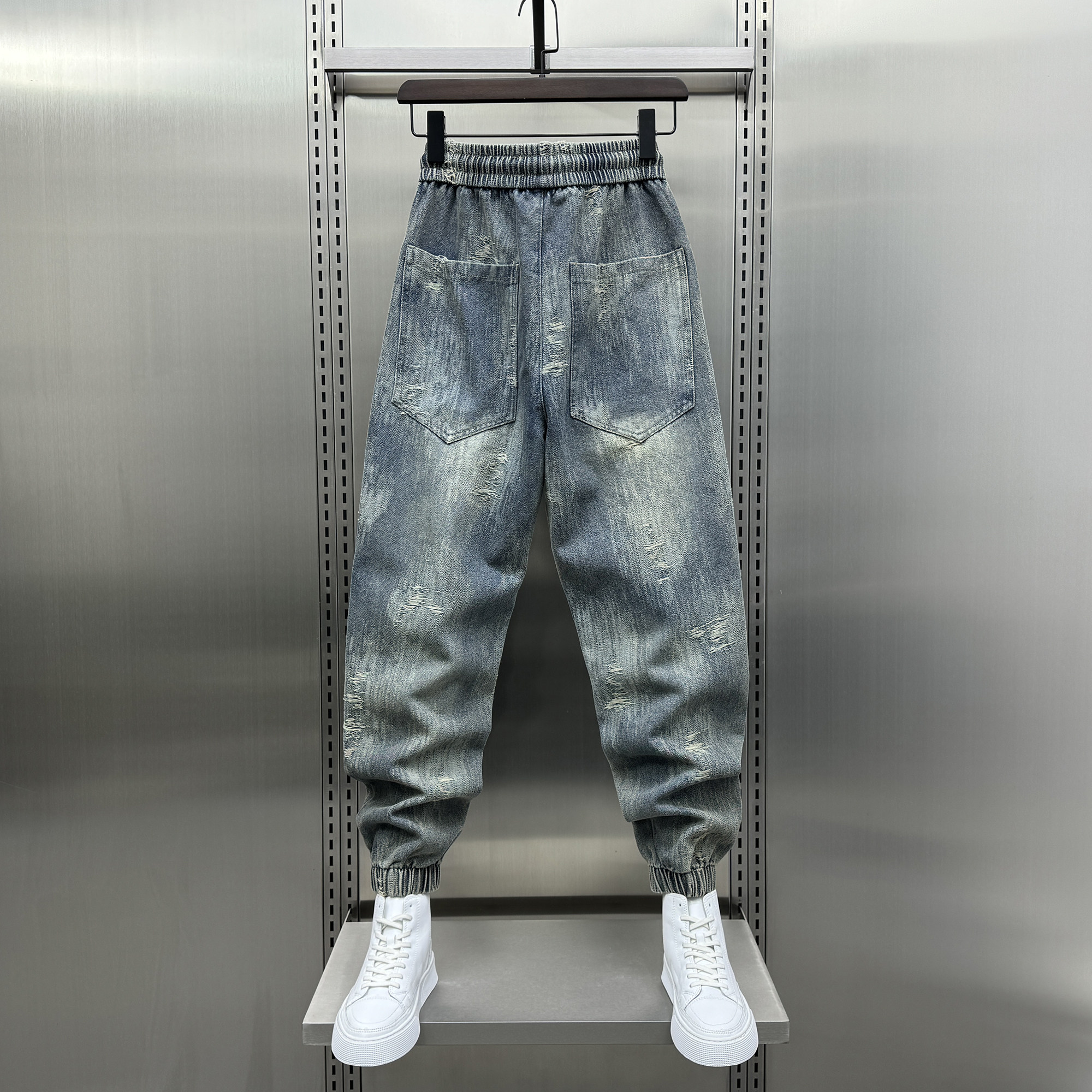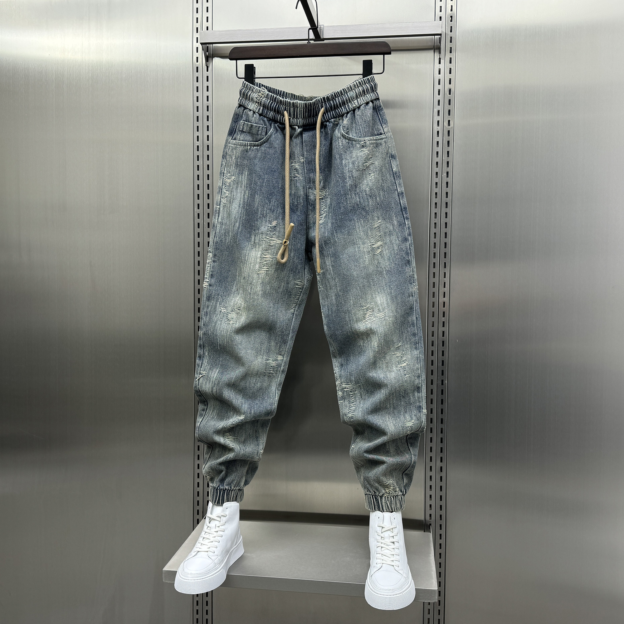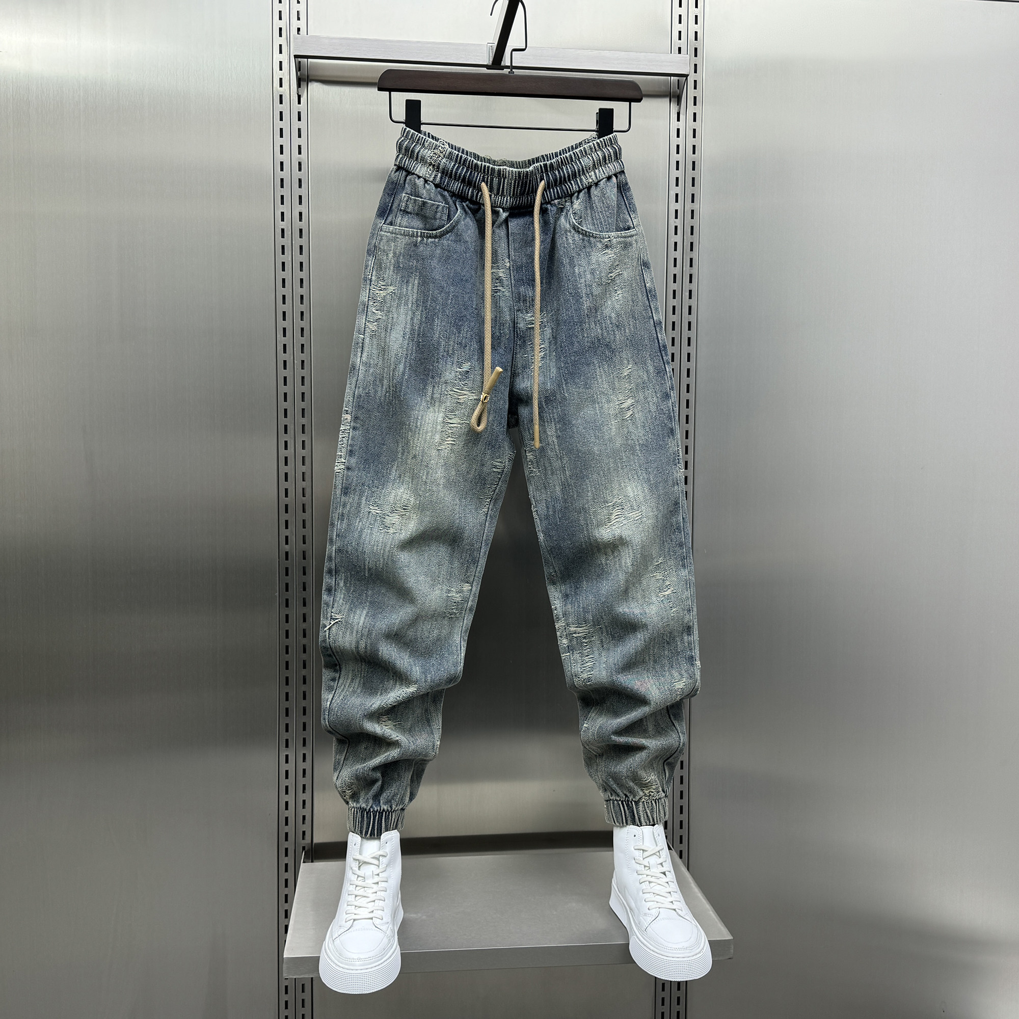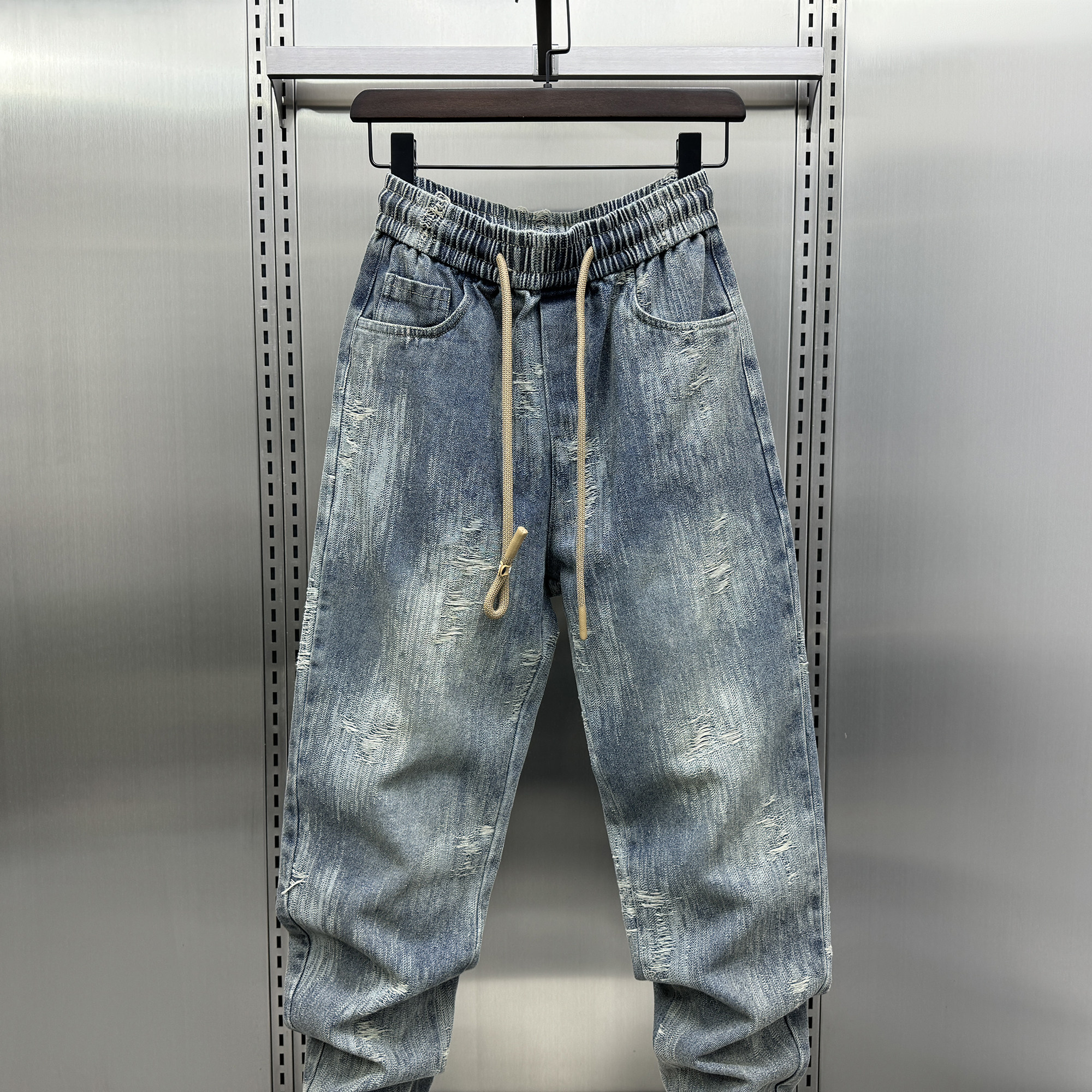 2024秋季新款设计感束脚牛仔裤男秋季宽松复古刮烂水洗哈伦休闲裤