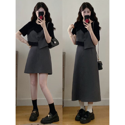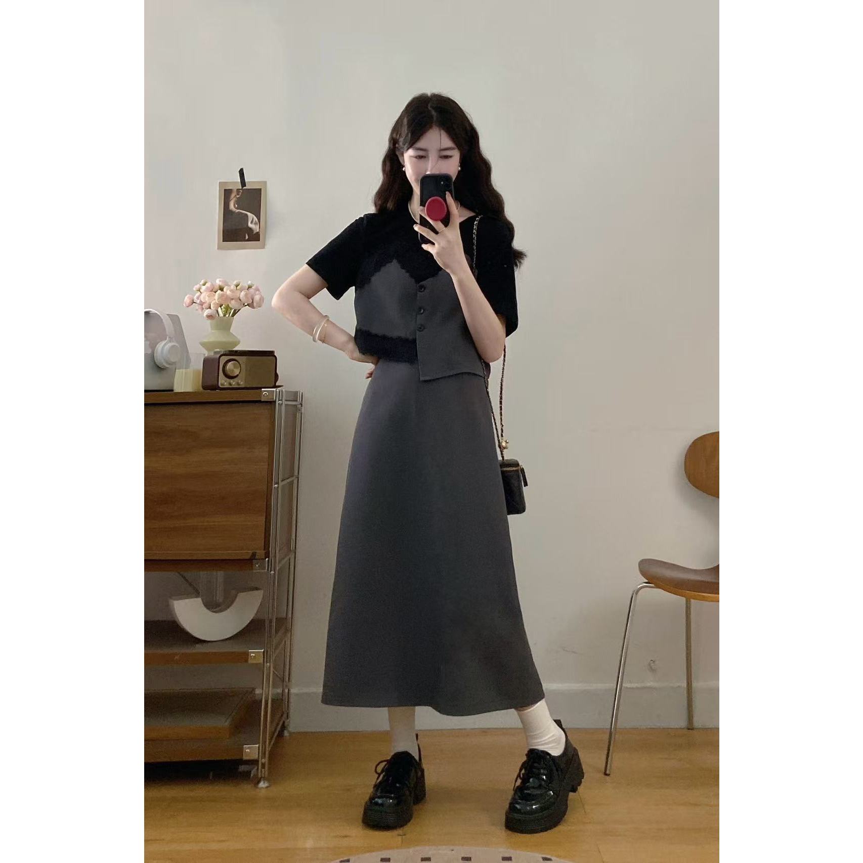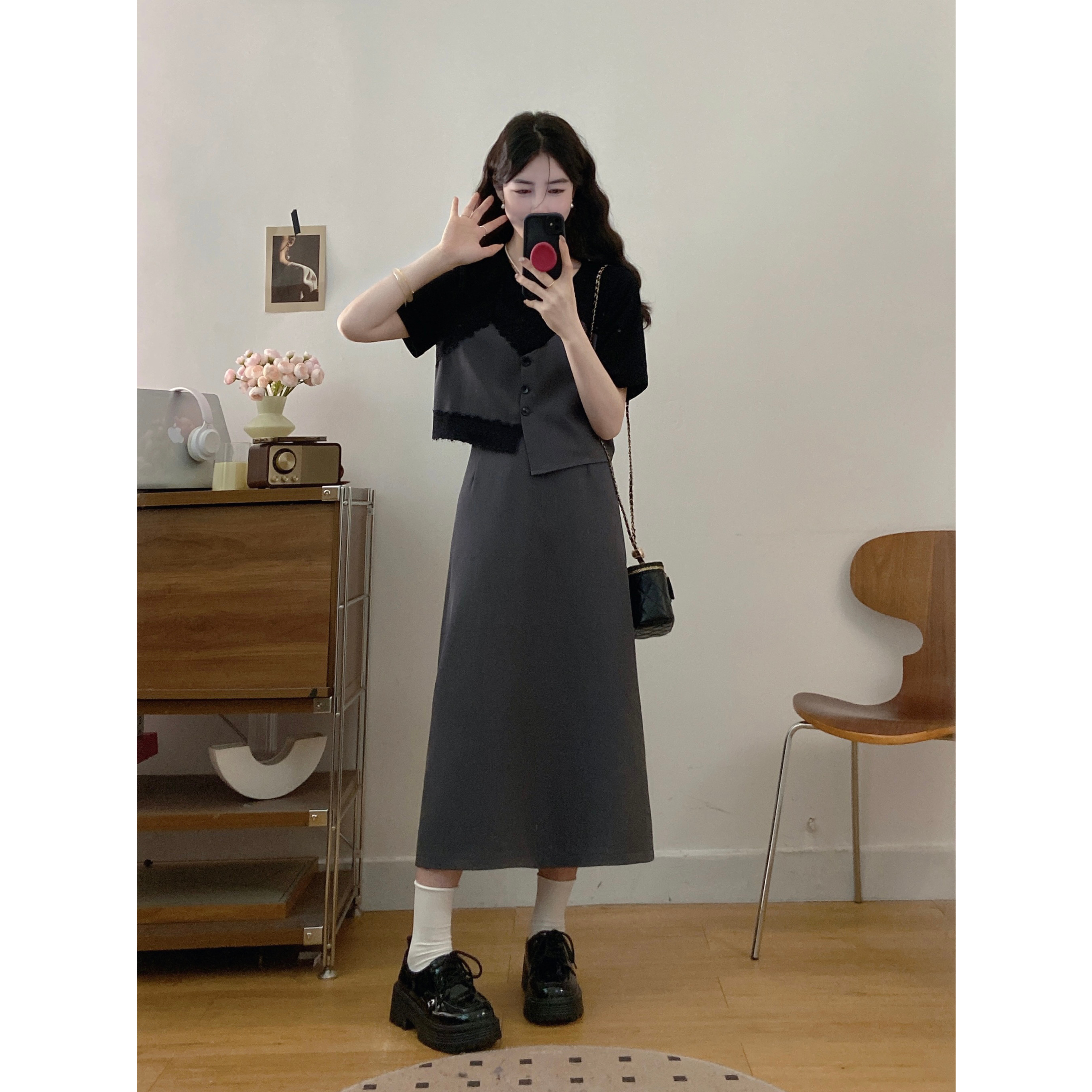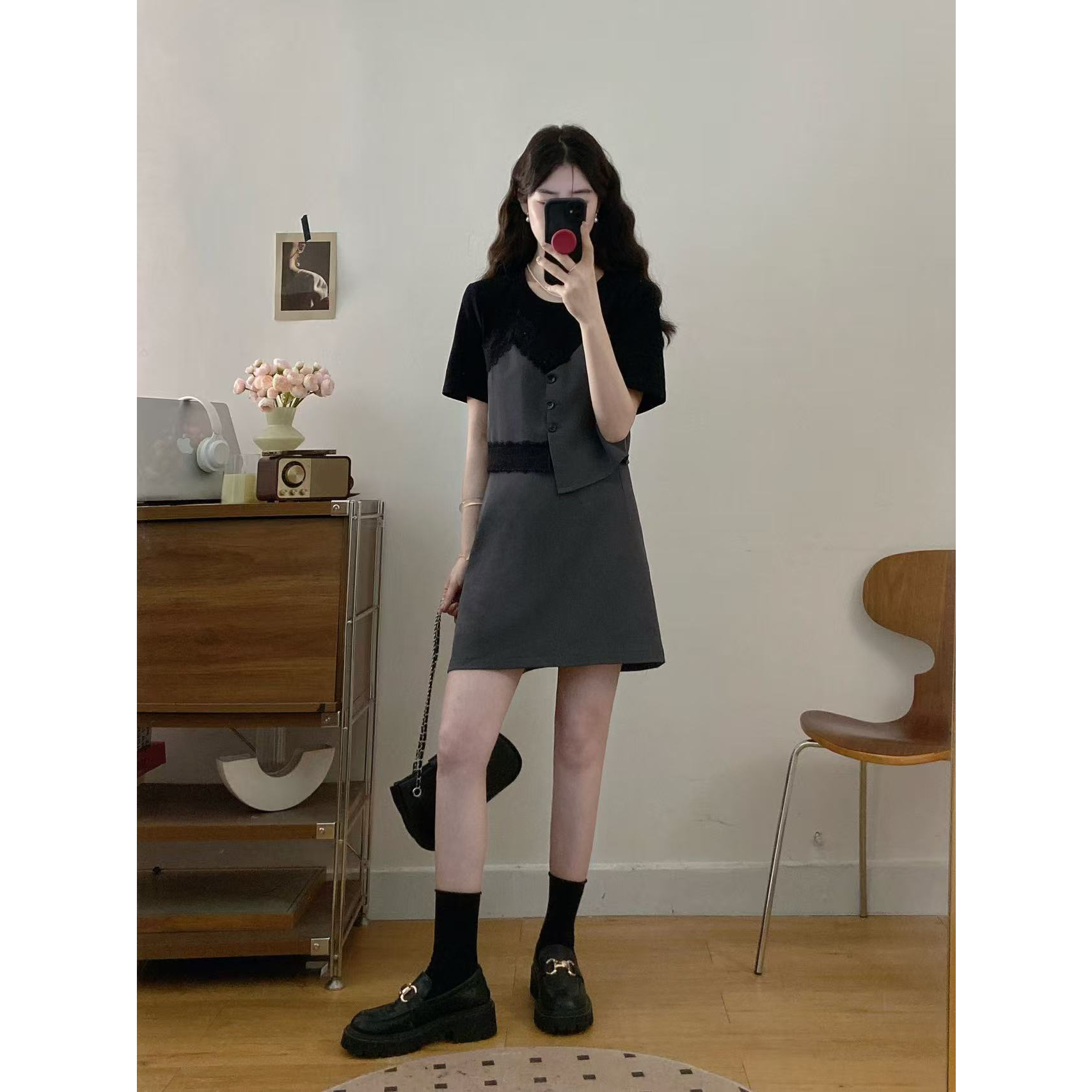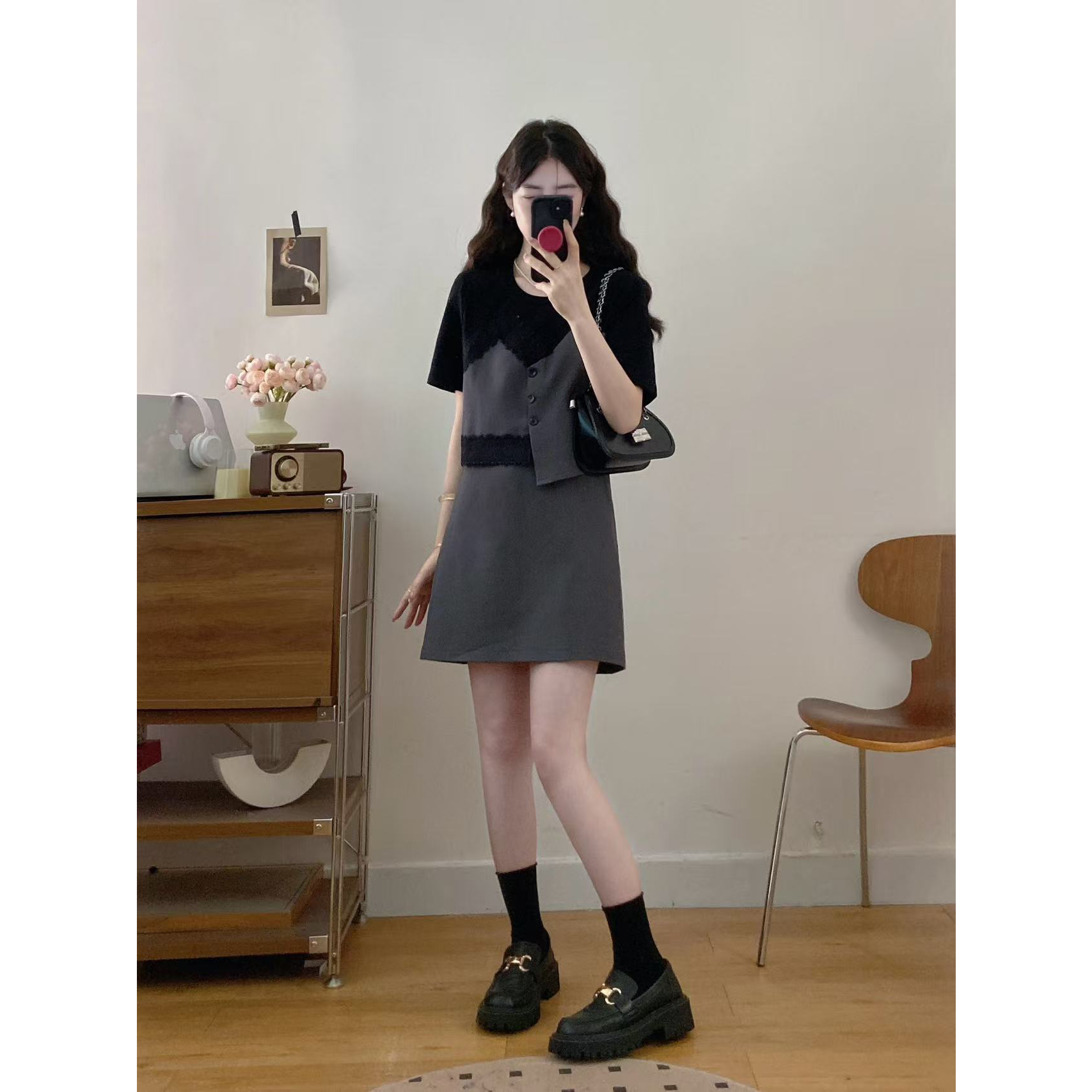 实拍 大码女装胖mm新款假两件蕾丝拼接上衣长短半身裙两件套
