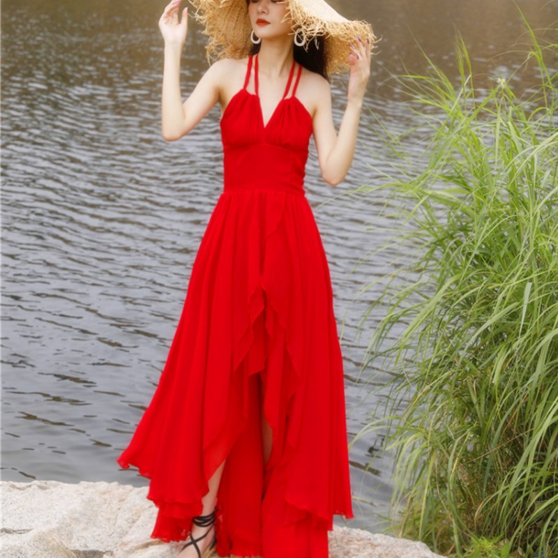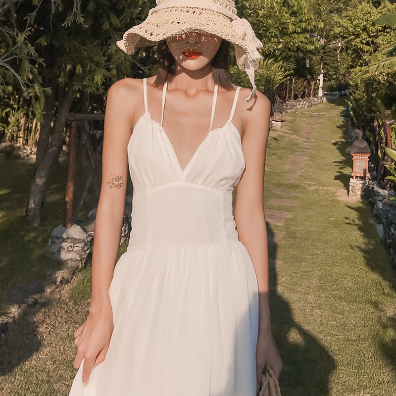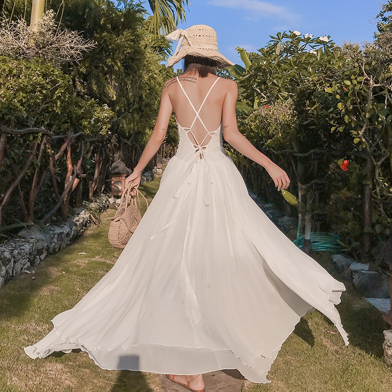 速发超仙长裙白色神沙滩裙海边度假性感露背吊带裙三亚大摆连衣裙