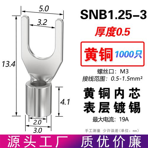 SNB1.25-3接线端子冷压线接头叉形Y/U型黄铜线耳鼻子裸端头1000只