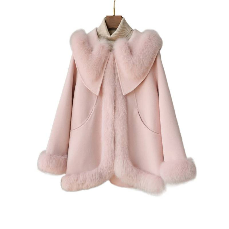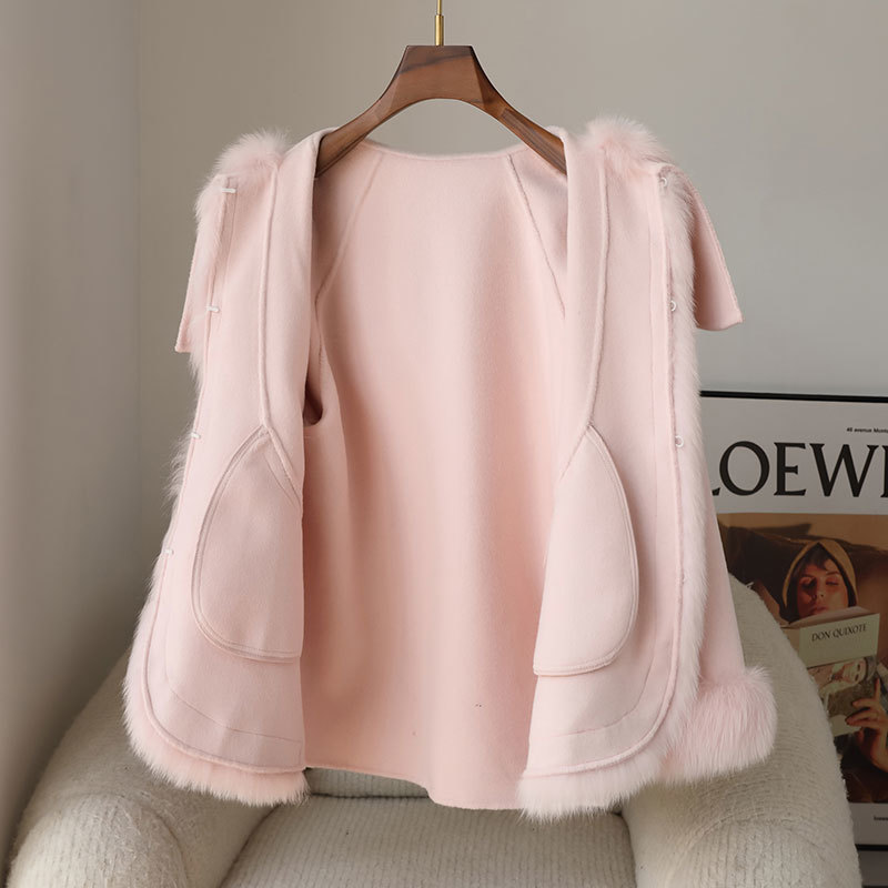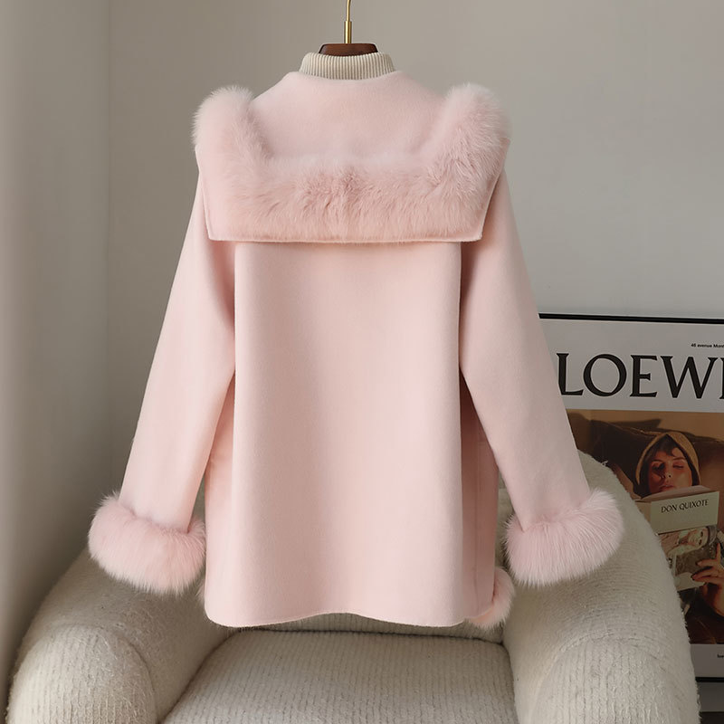 秋冬新款海军领甜美短款狐狸毛羊毛皮外套双面呢羊绒大衣毛呢女