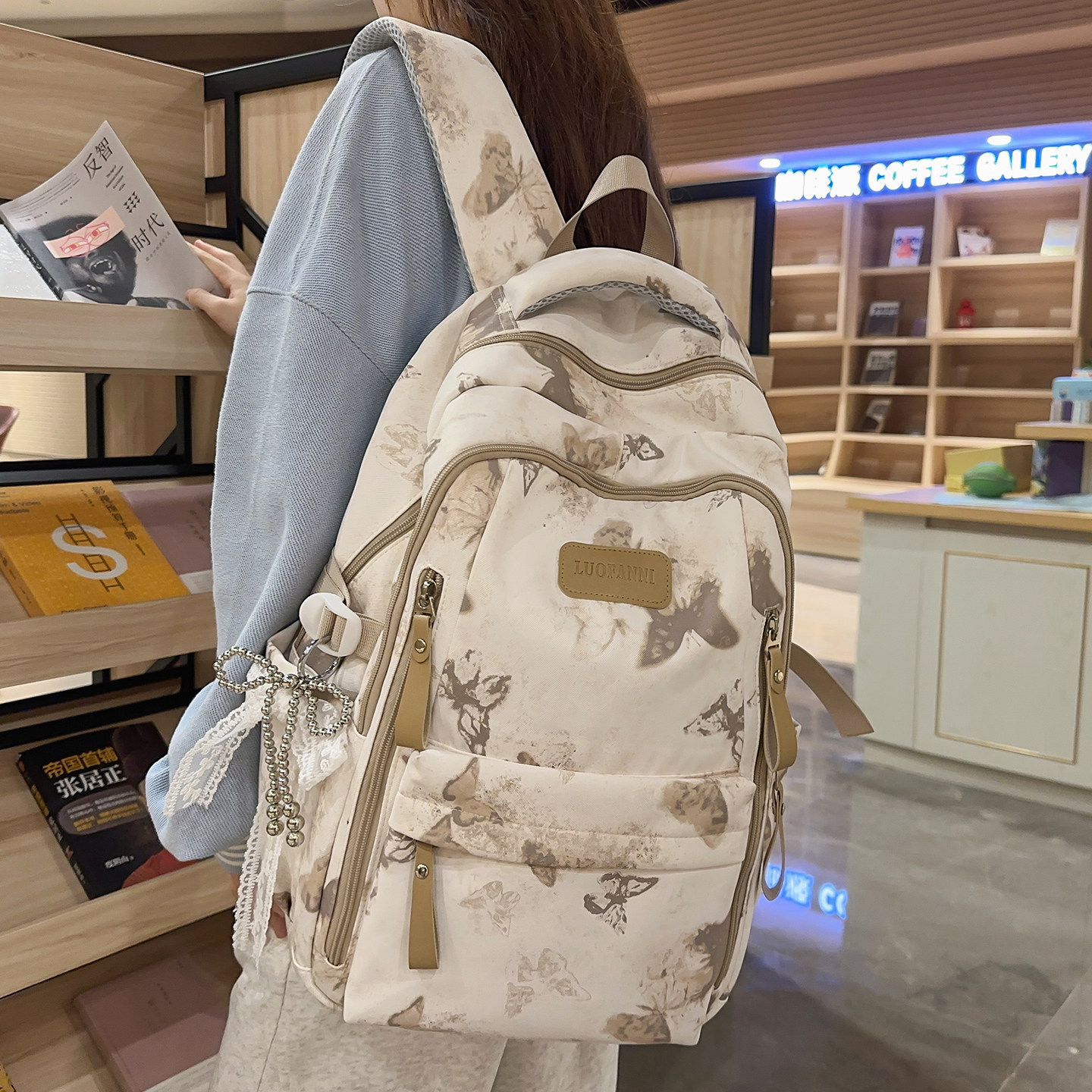 百搭蝴蝶印花初中生双肩包轻便