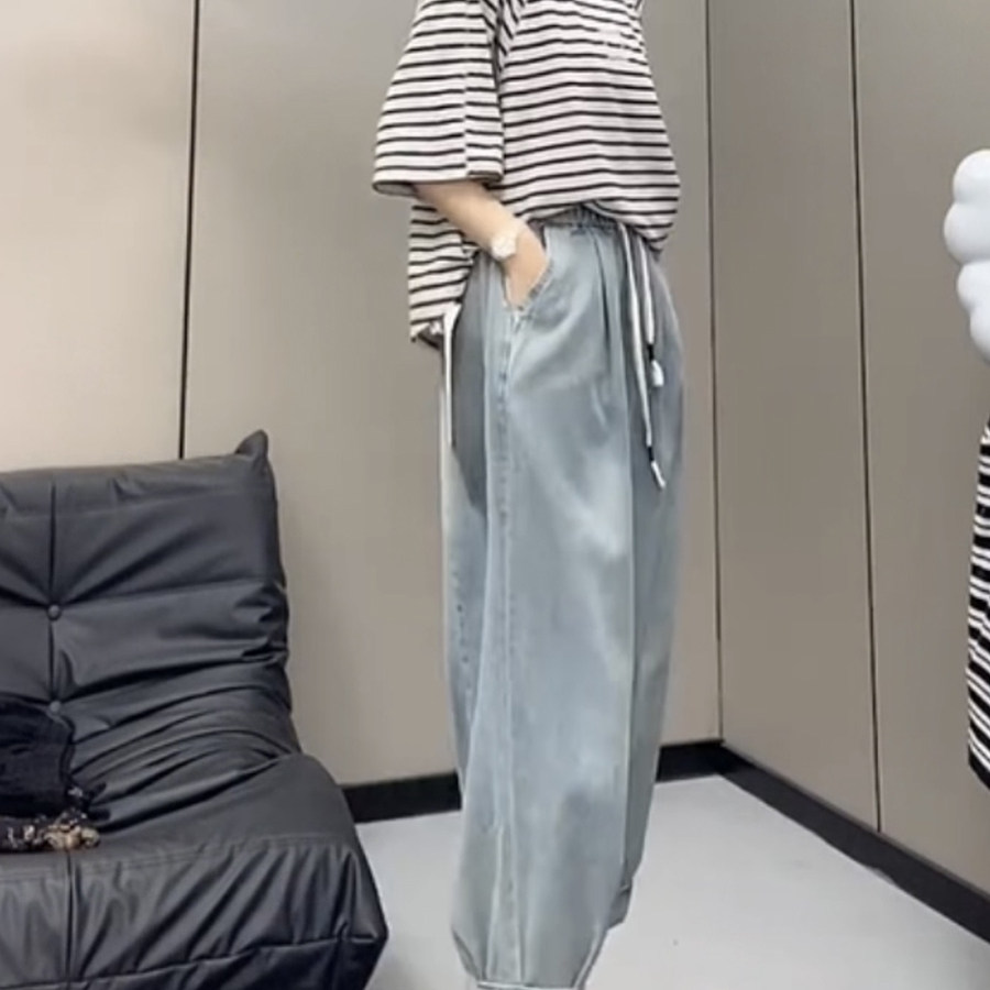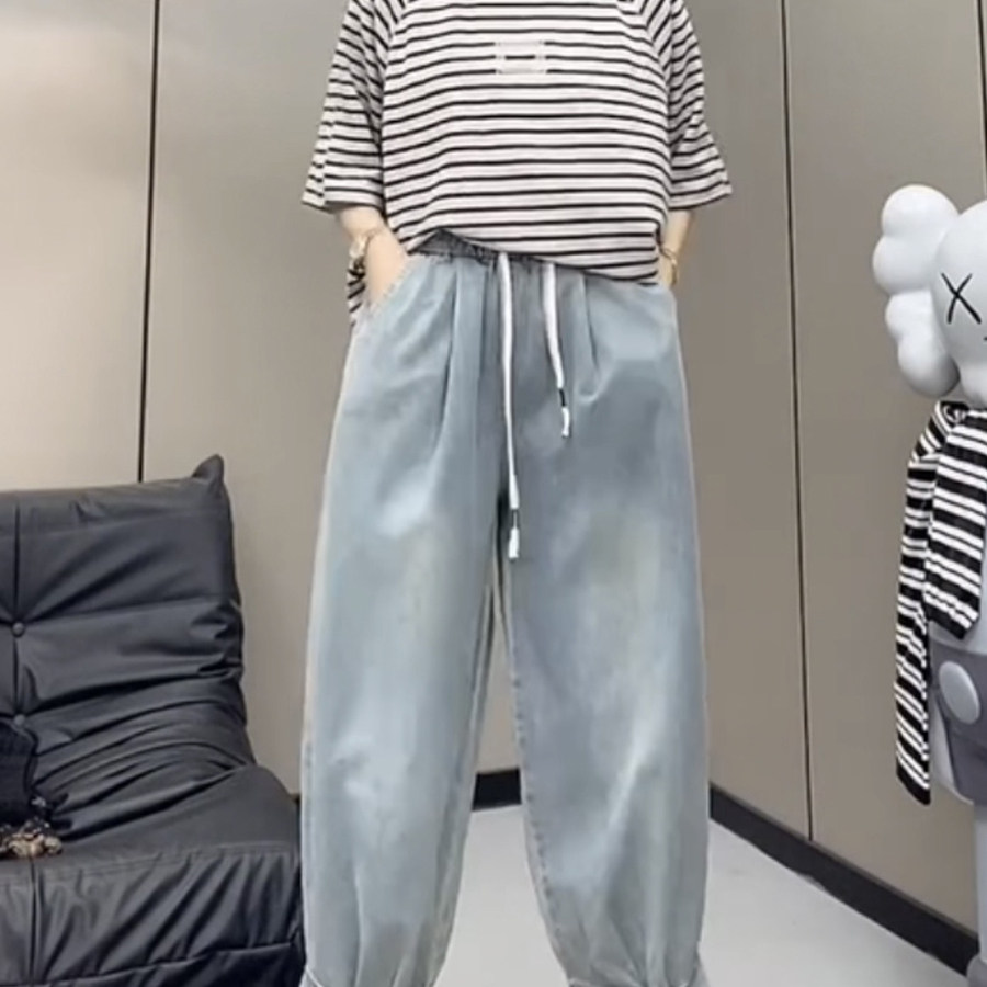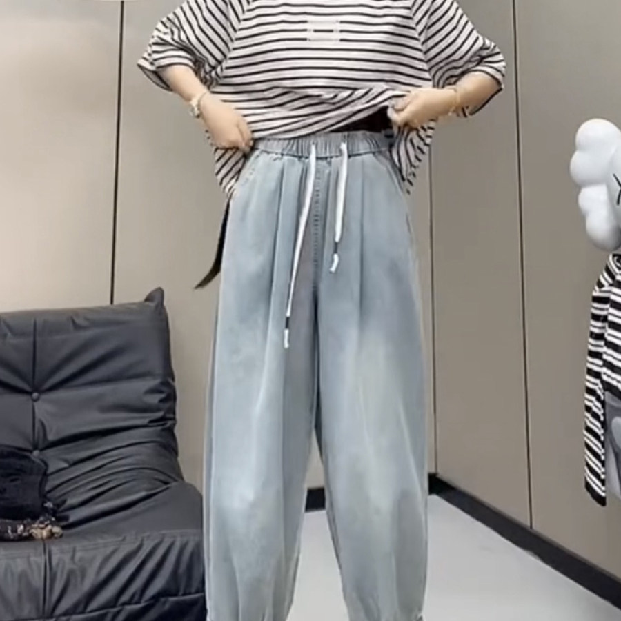 夏季新款松紧腰老爹牛仔裤女胯大腿粗显瘦哈伦裤宽松洋气萝卜裤子