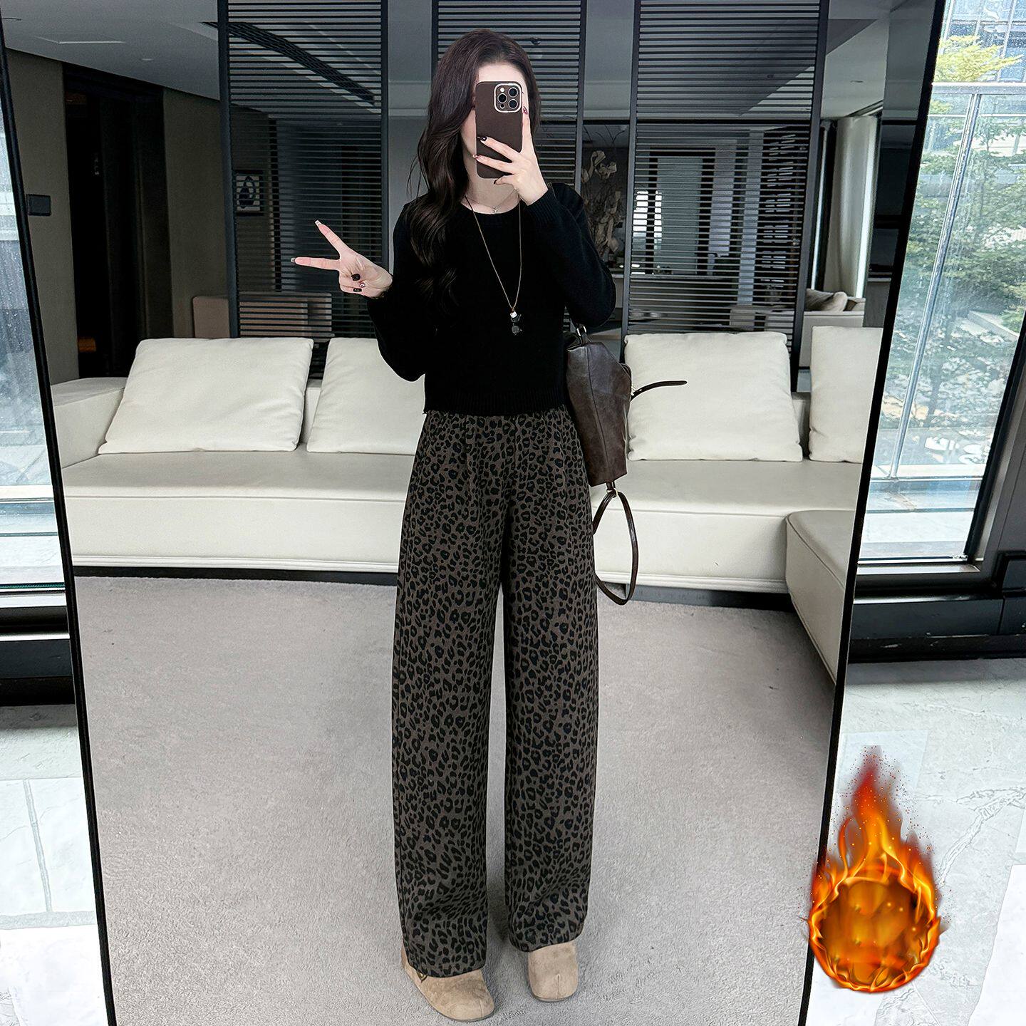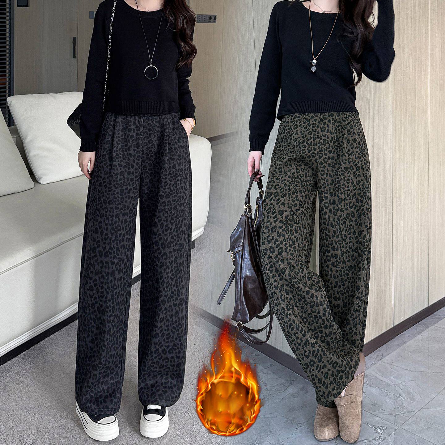 150小个子定制豹纹加绒休闲毛呢裤女冬季厚款松紧腰9分阔腿弯刀裤