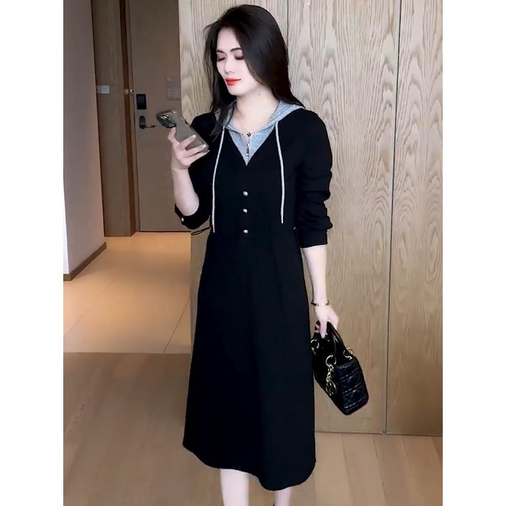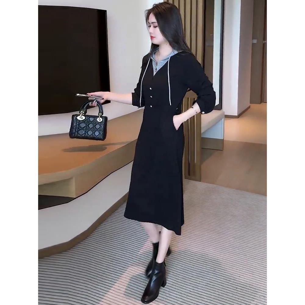外贸出口转内销连衣裙新款今流行爆款春秋款假两件连帽收腰设计长
