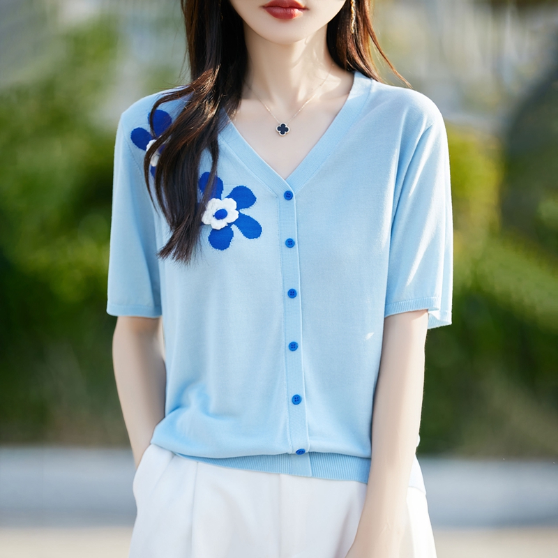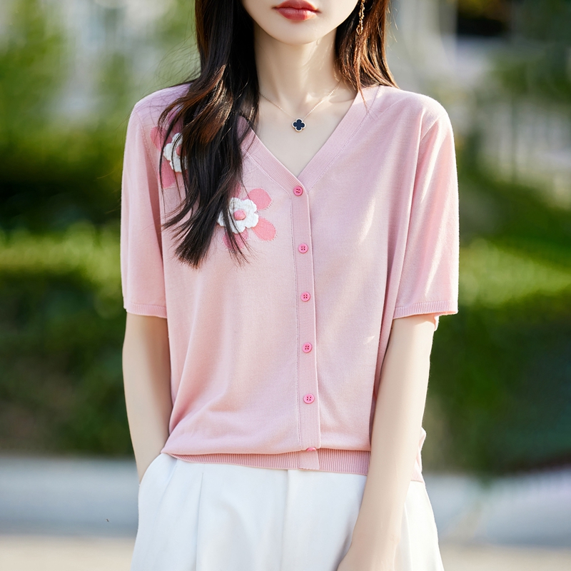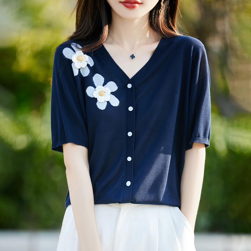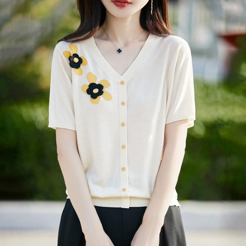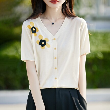 夏季100%天丝针织短袖开衫女V领立体花朵刺绣上衣宽松半袖打底T恤
