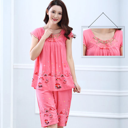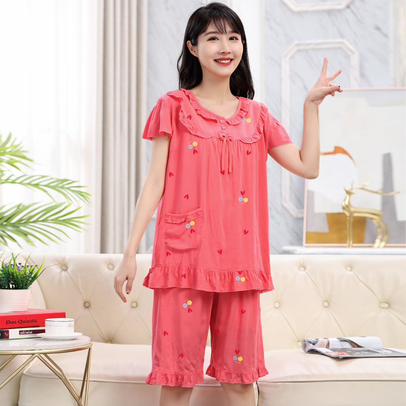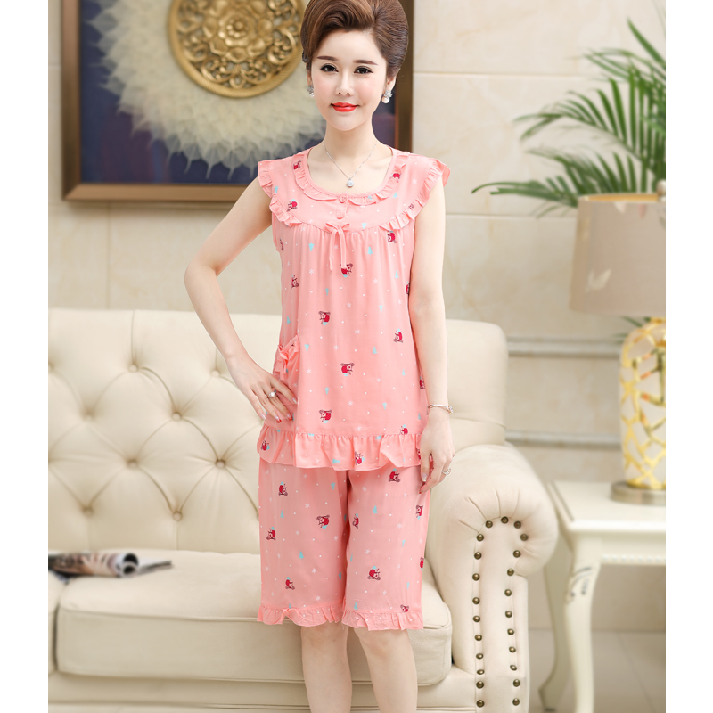 绵绸女士睡衣夏季纯棉绸短袖短裤无袖宽松大码中年妈妈家居服套装