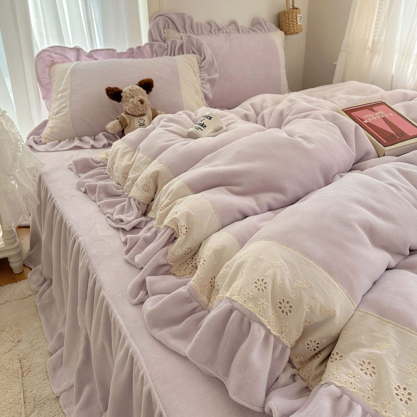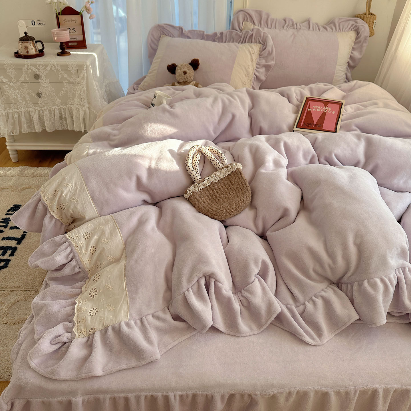 冬季浪漫法式花边牛奶绒床裙四件套公主风珊瑚绒加绒被套床单床笠