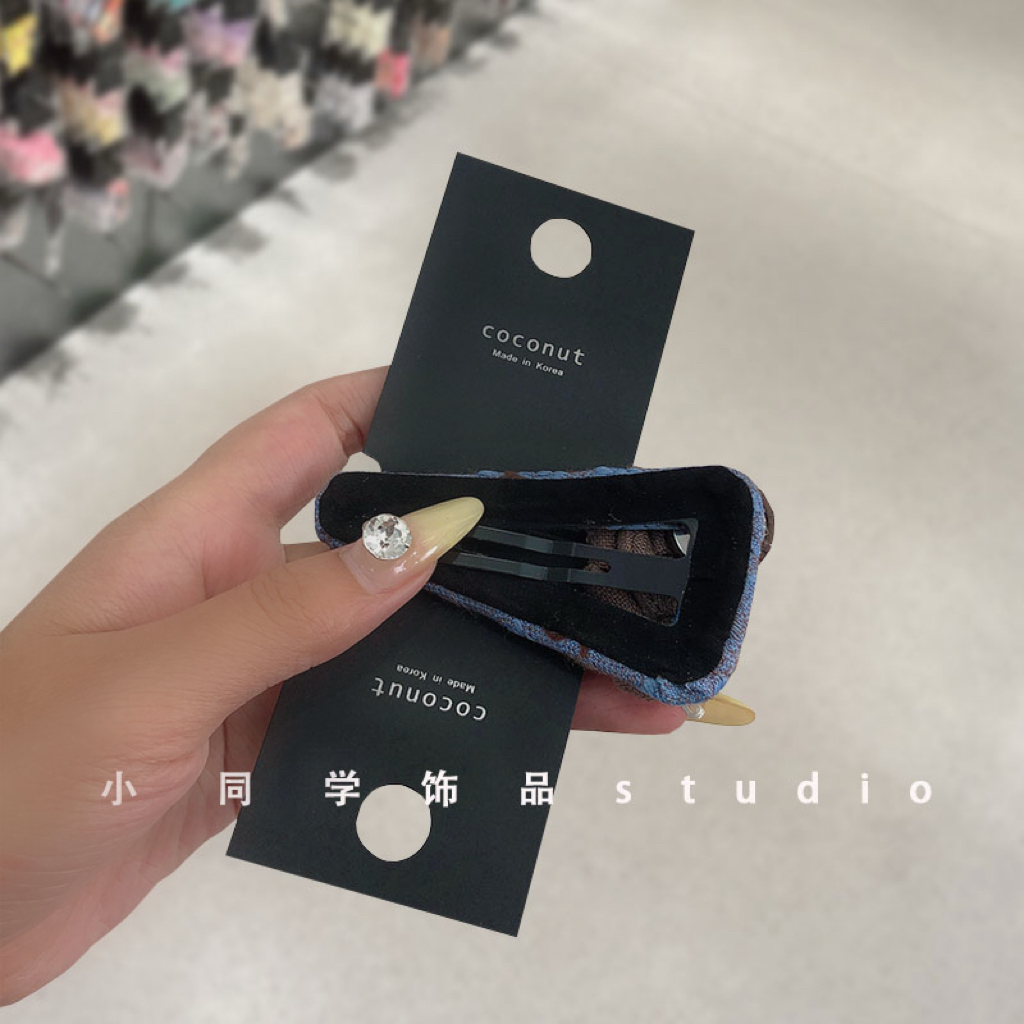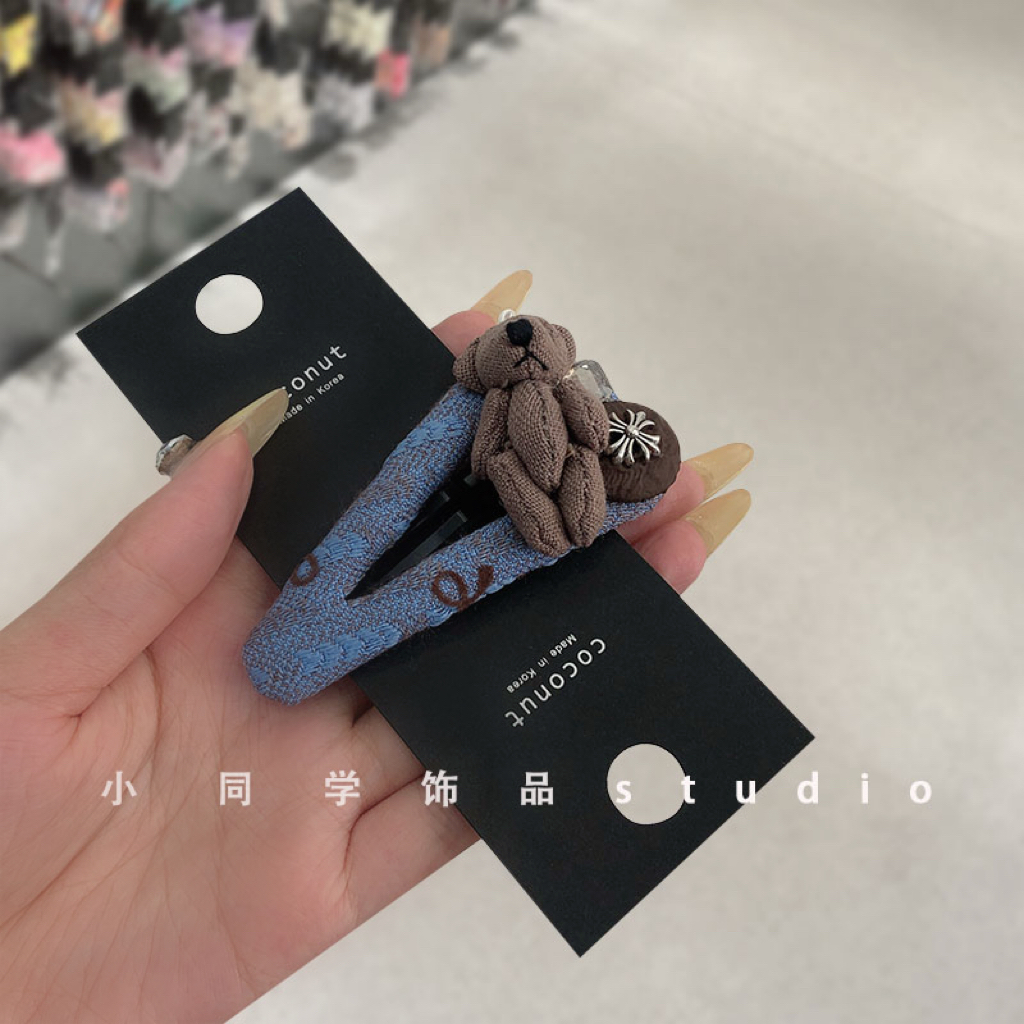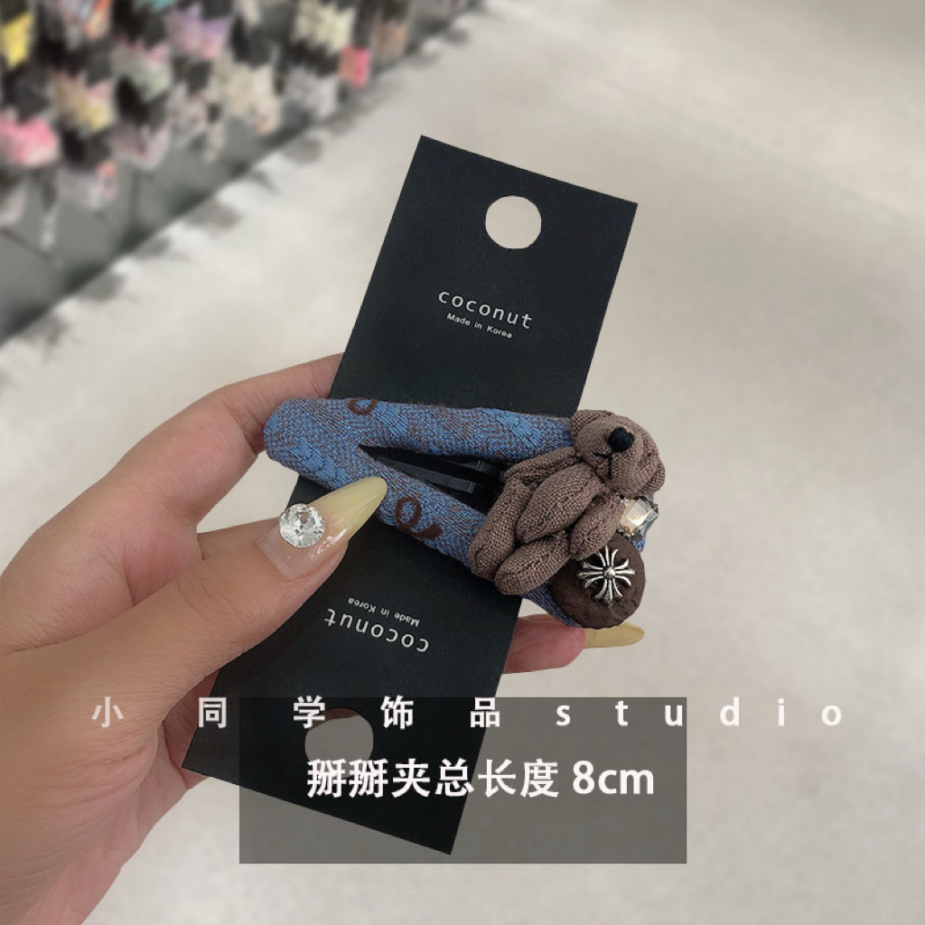 韩国发饰2025新款高级感精致蓝色刺绣蝴蝶结印花小熊玩偶发夹边夹