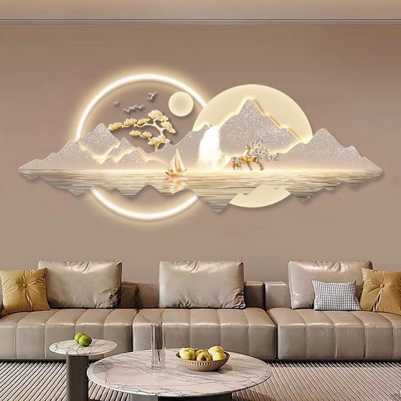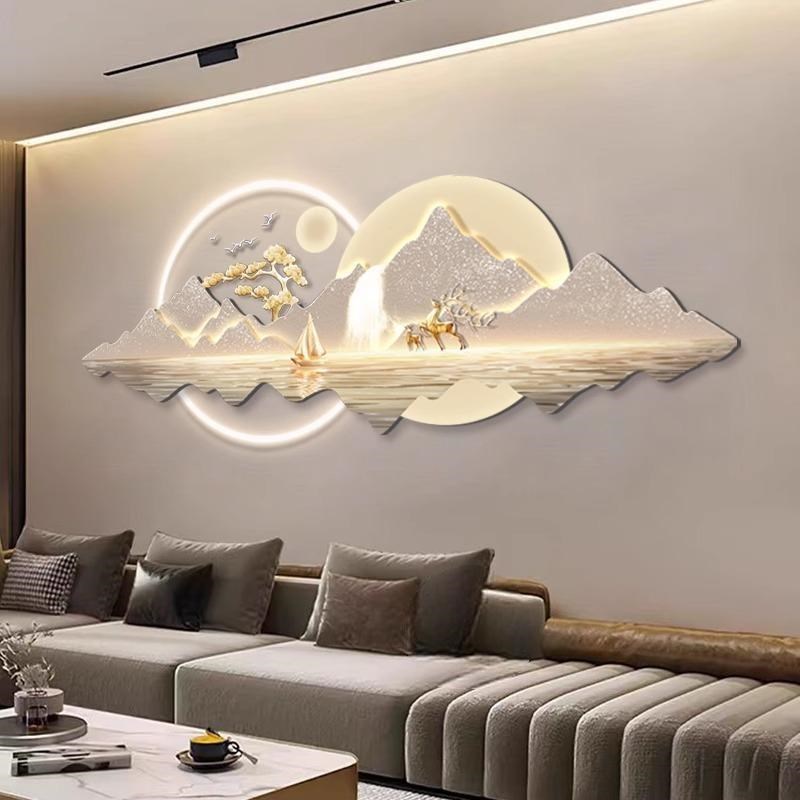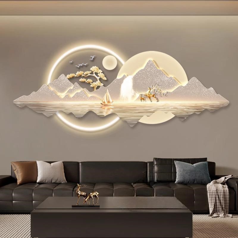 热销现代轻奢客厅led装饰画背有靠山带灯沙发背景墙挂画大气山水