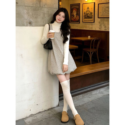 秋冬温柔甜妹U领无袖碎花花苞背心连衣裙+长袖针织打底衫两件套装