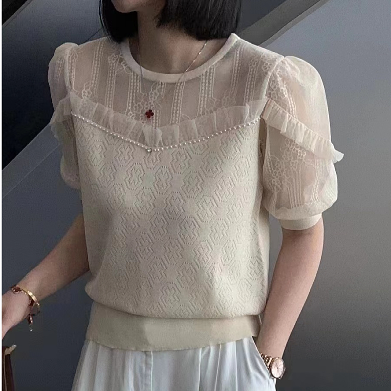 南油时尚荷叶边冰丝T恤女2025夏新款粉色上衣拼接短袖欧货针织衫