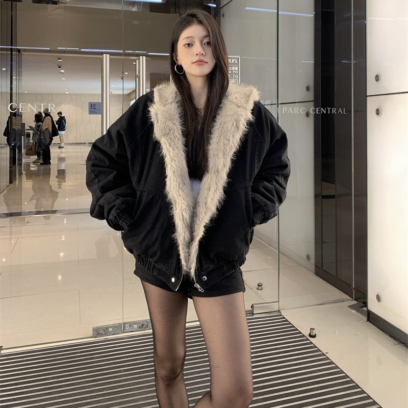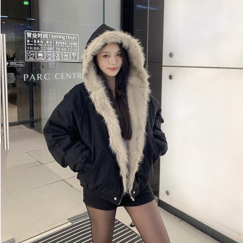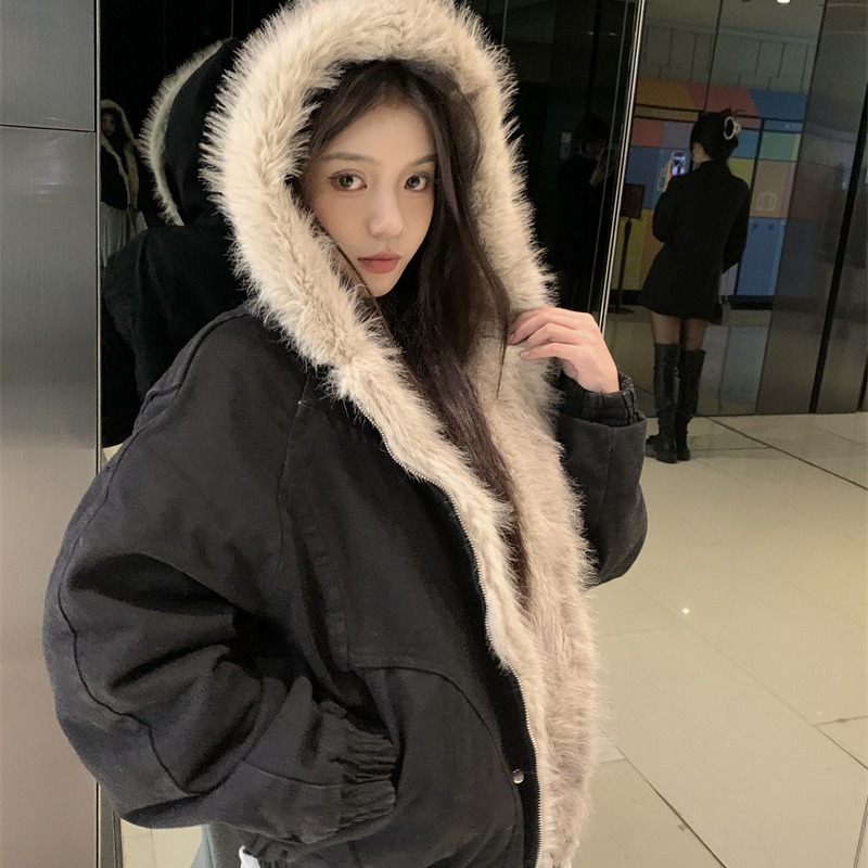 韩系慵懒风复古毛领牛仔连帽棉服女秋冬新款加厚保暖夹克工装外套