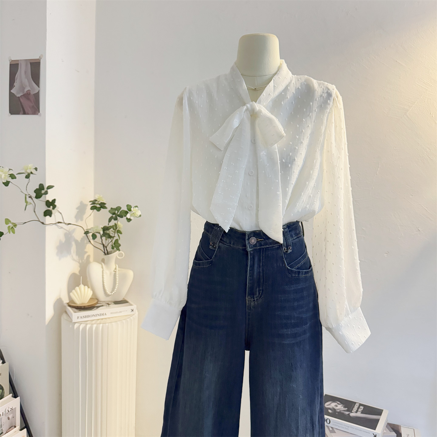 法式系带蝴蝶结波点雪纺长袖衬衫