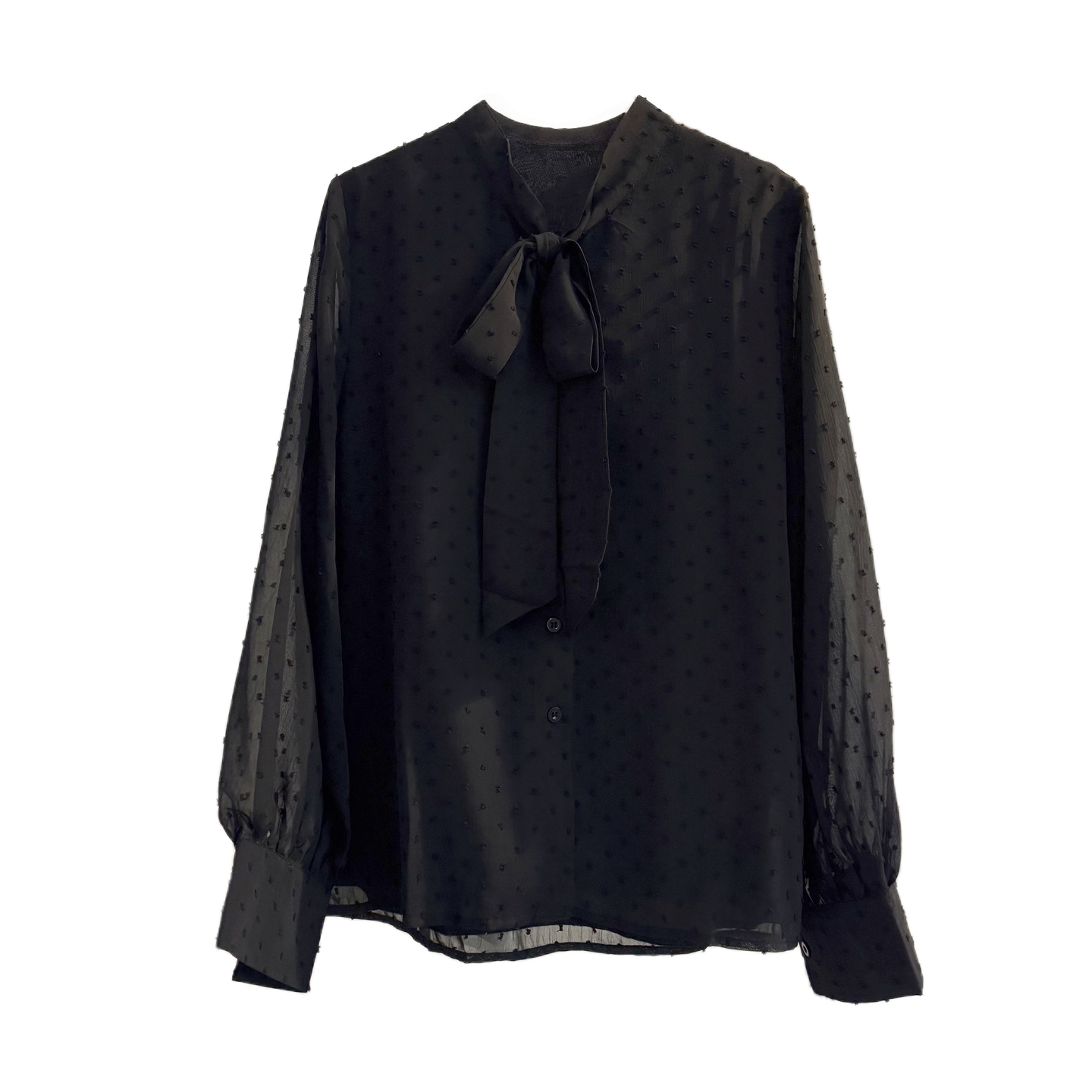 黑色系带蝴蝶结波点雪纺衬衫女长袖2025秋设计感飘带衬衣小衫上衣