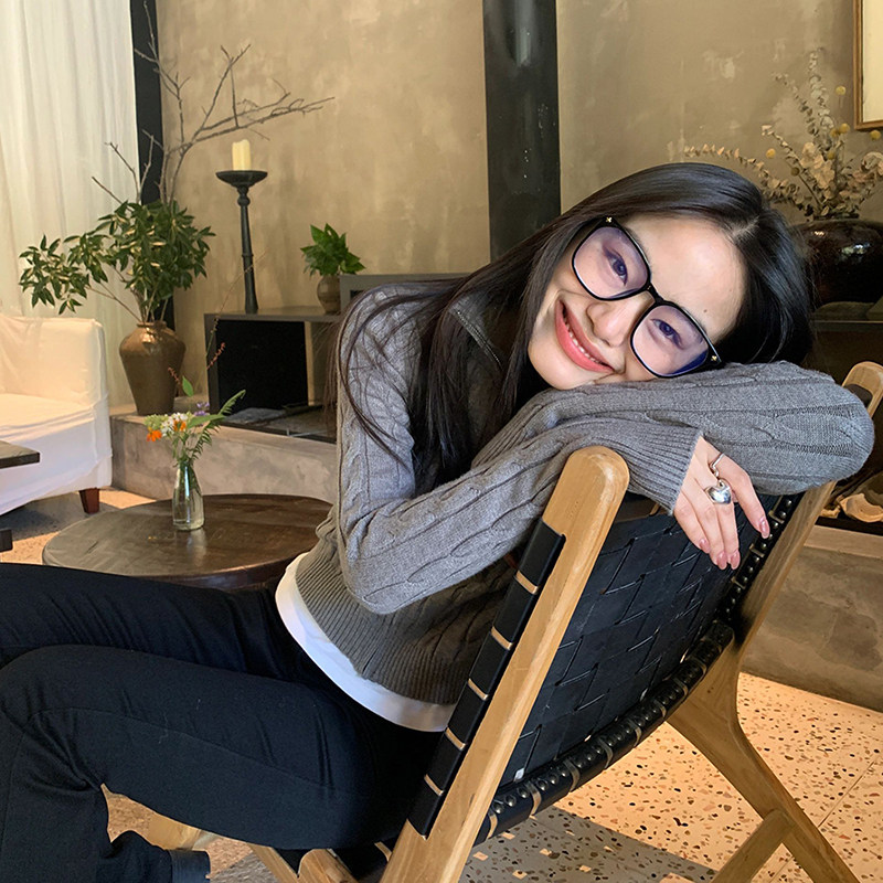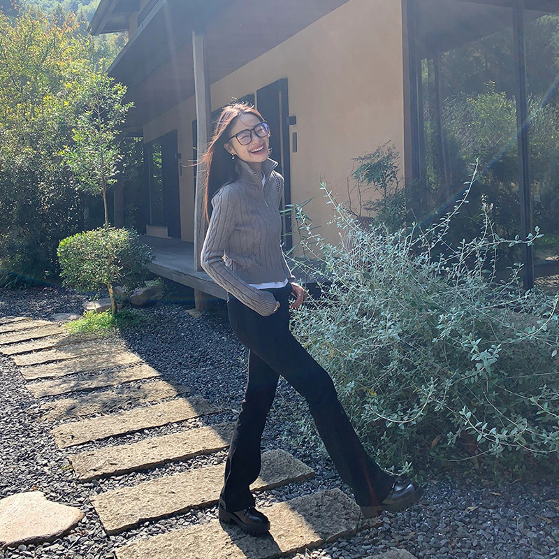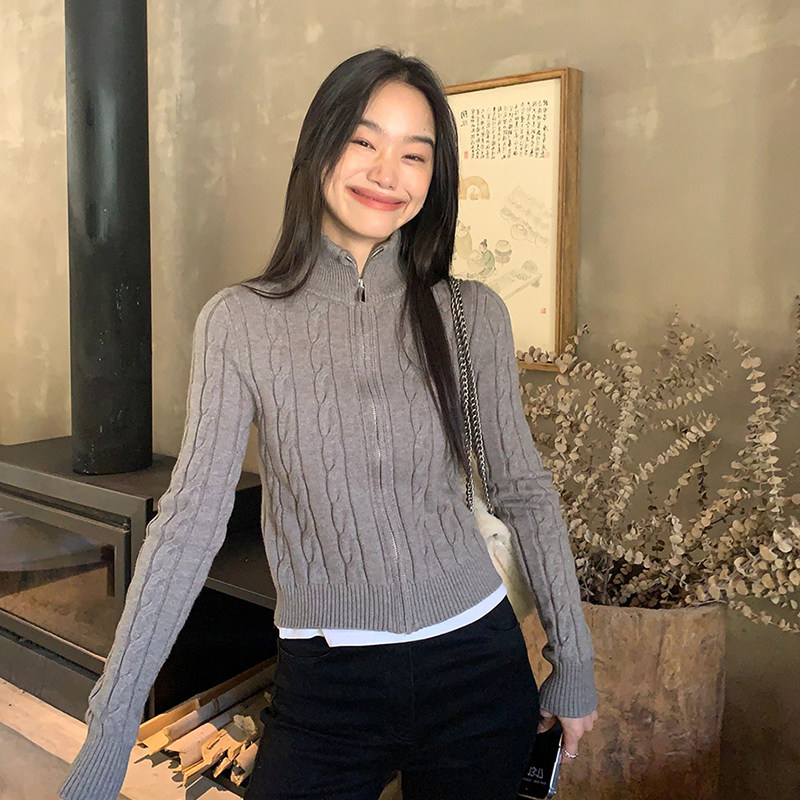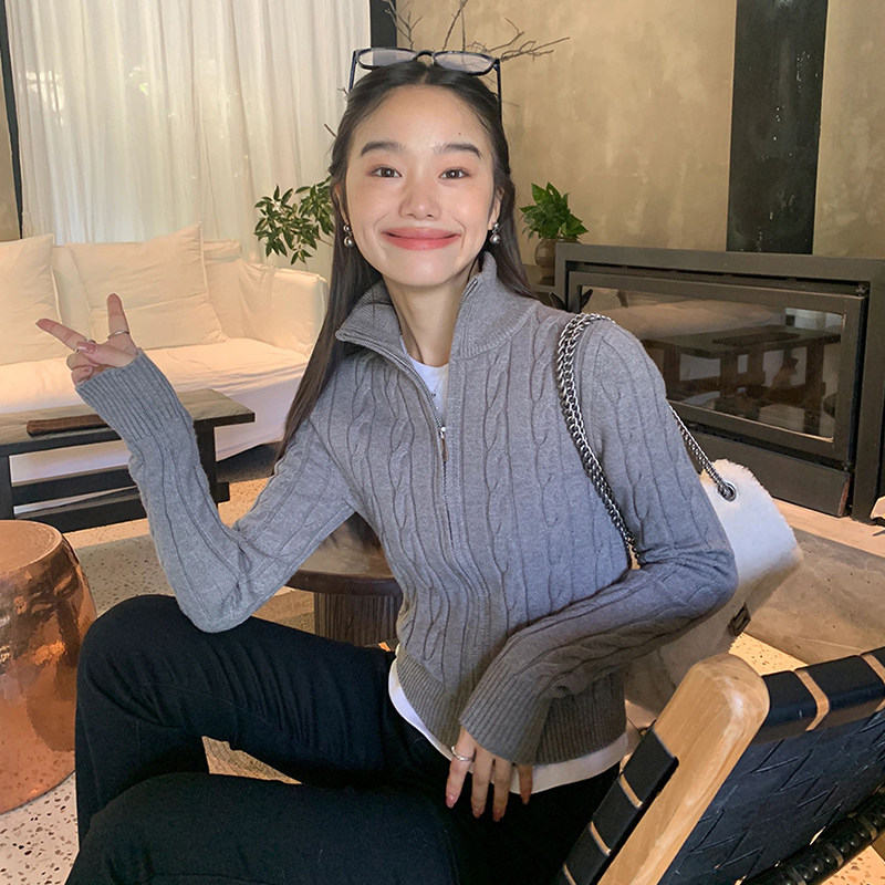 美式灰色麻花高领针织开衫女秋冬老钱风穿搭修身短款毛衣外套上衣