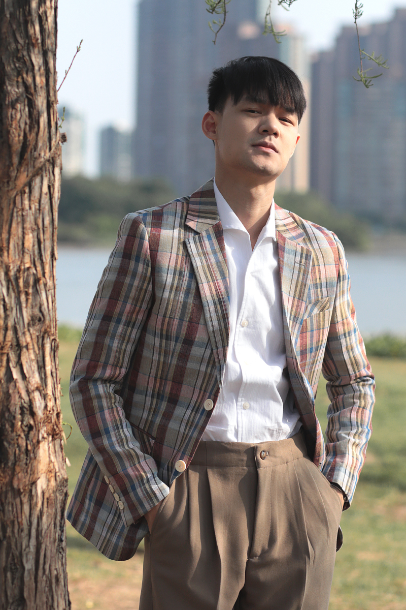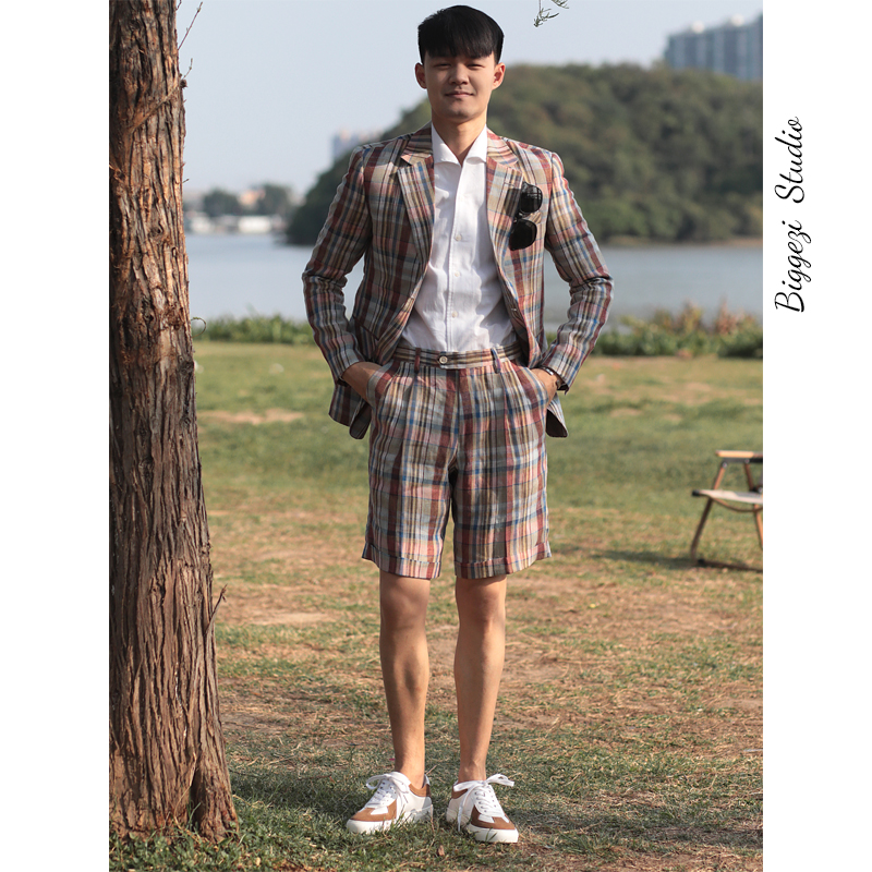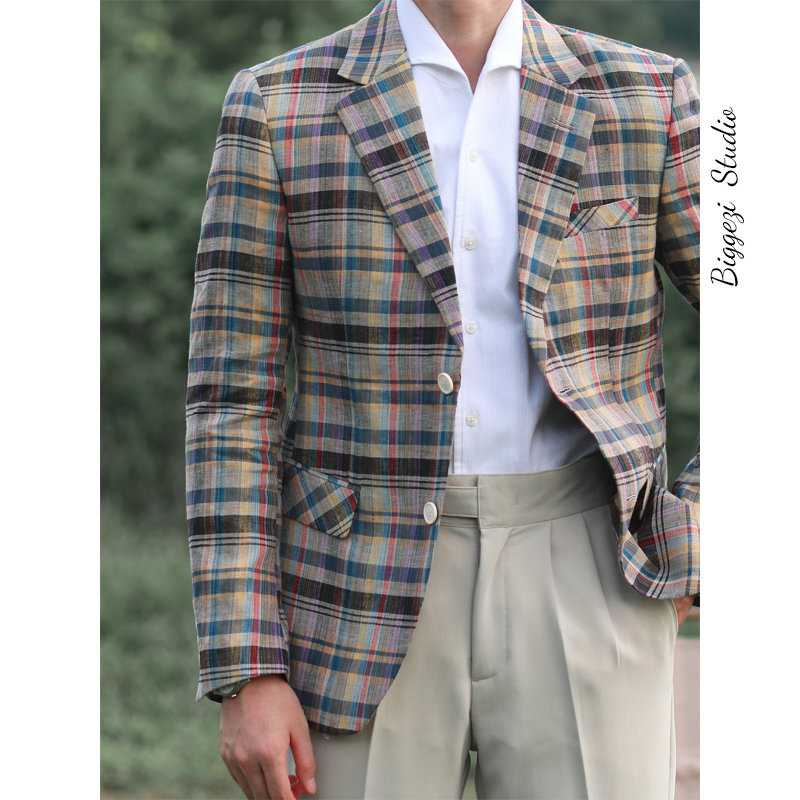 [两色]英伦雅痞绅士亚麻修身春夏格子条纹轻奢度假风特色西装外套