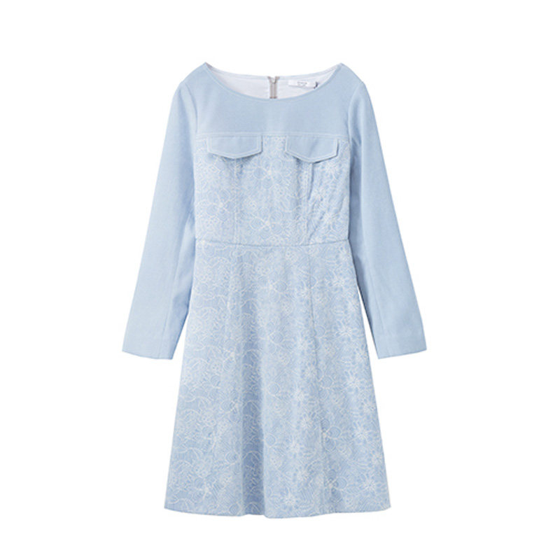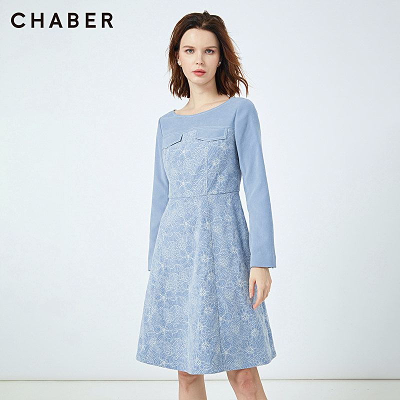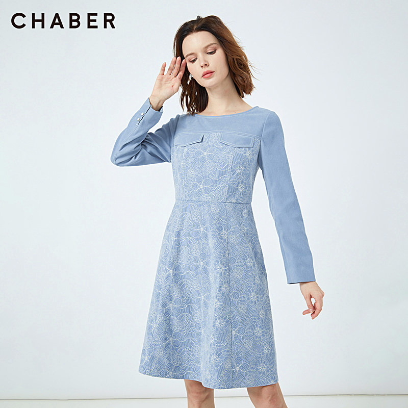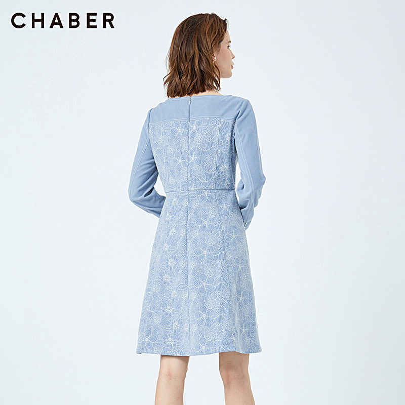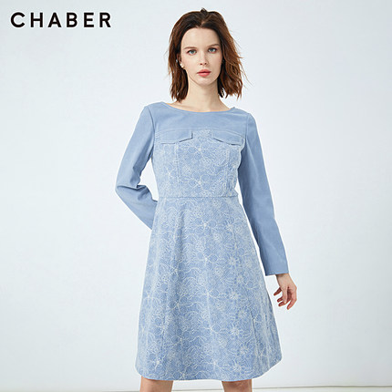 chaber巧帛新品商场同款绒面绣花收腰圆领女连衣裙中长款114704