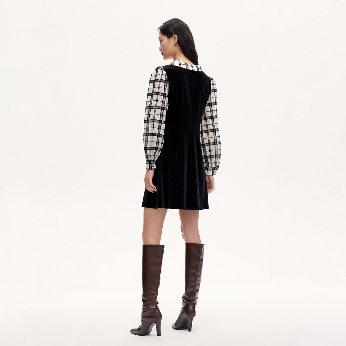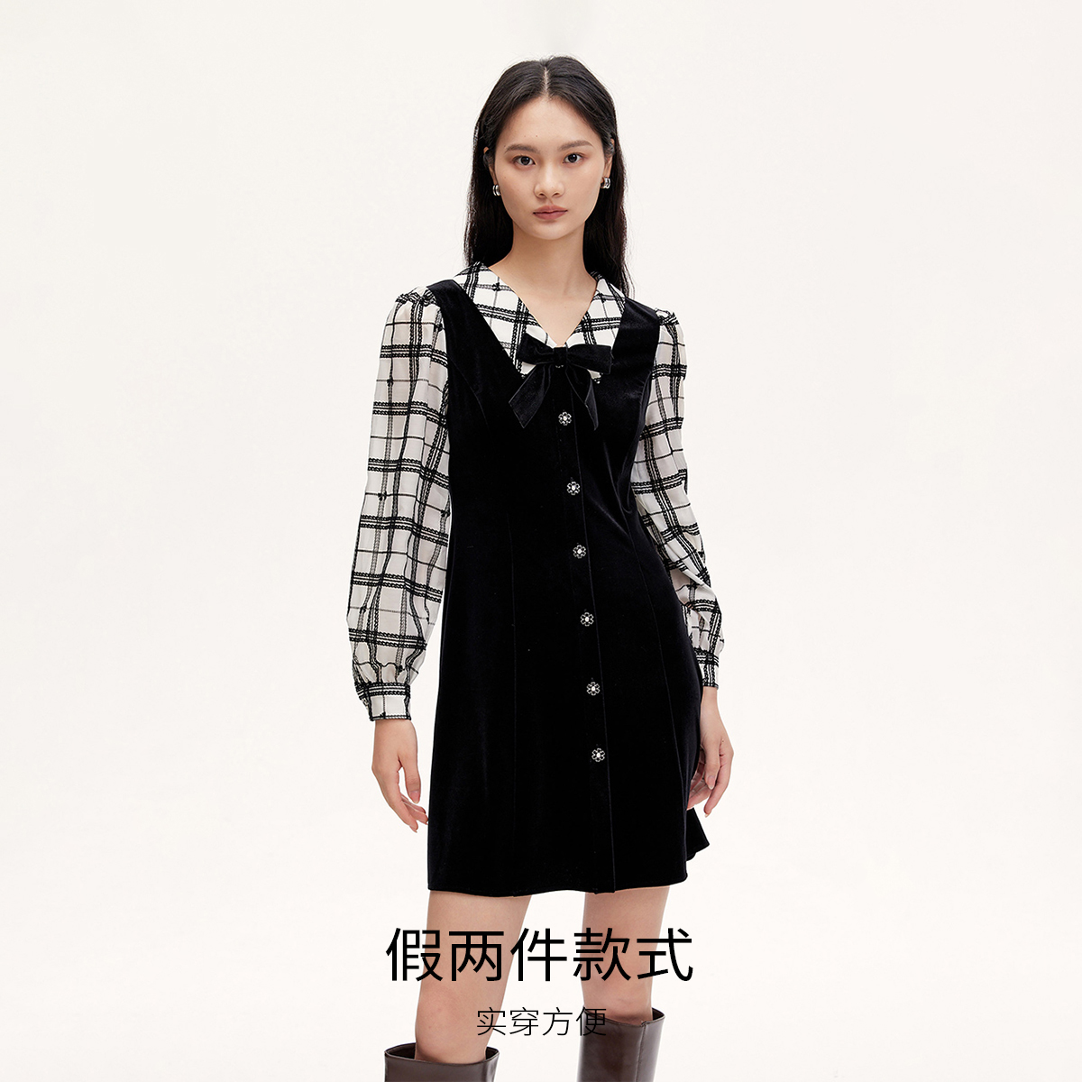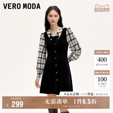 Vero Moda奥莱连衣裙秋季新款拼接格纹袖收腰A字丝绒裙学院风流行
