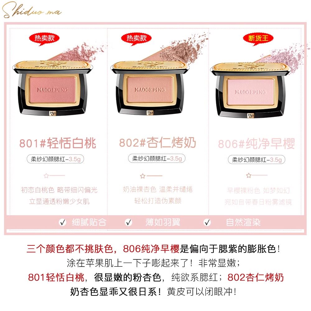 毛戈平柔纱幻颜腮红806膨胀色 哑光自然提亮提升气色胭脂现货正品