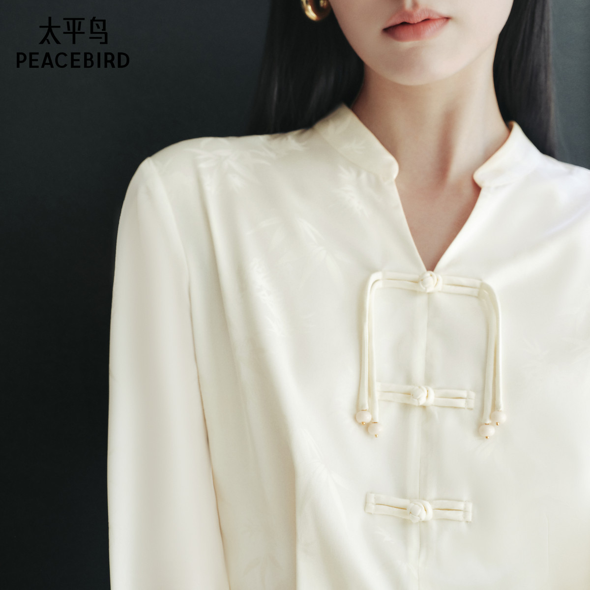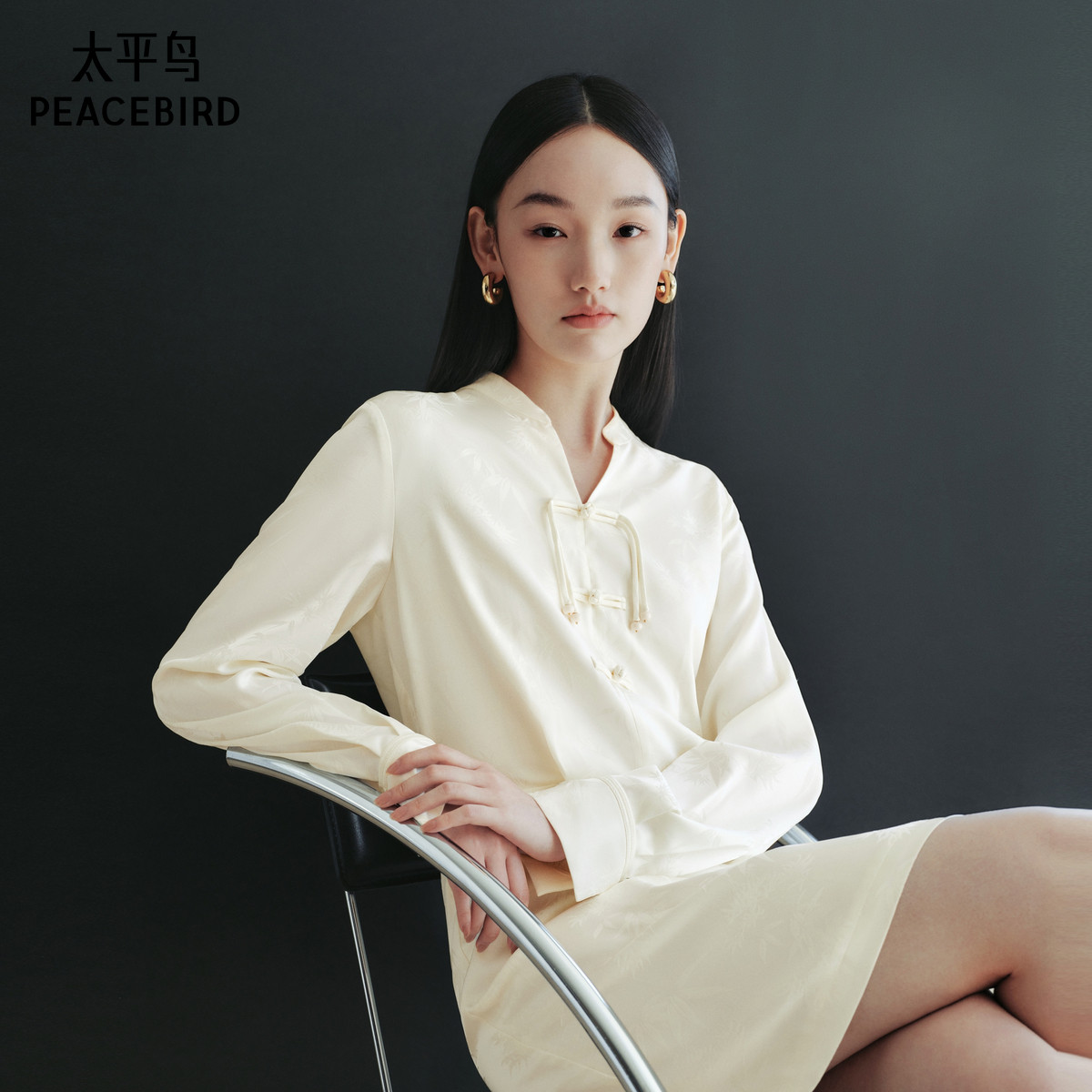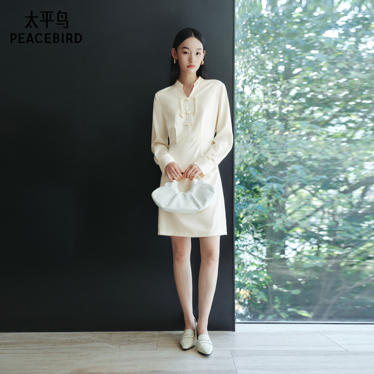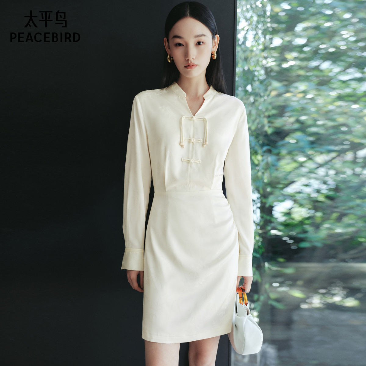 太平鸟国风假两件连衣裙长袖25春新款叶提花缎面短款显瘦新中式