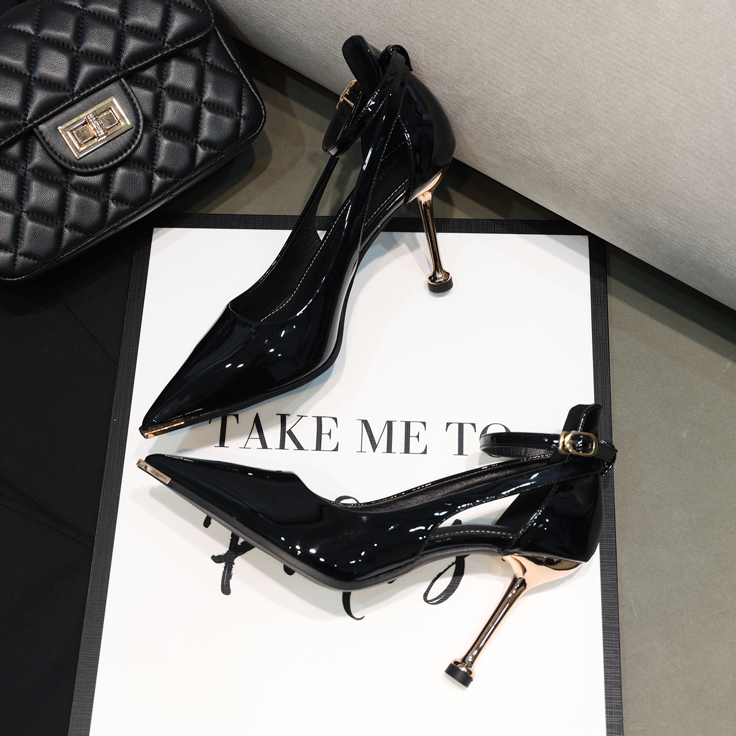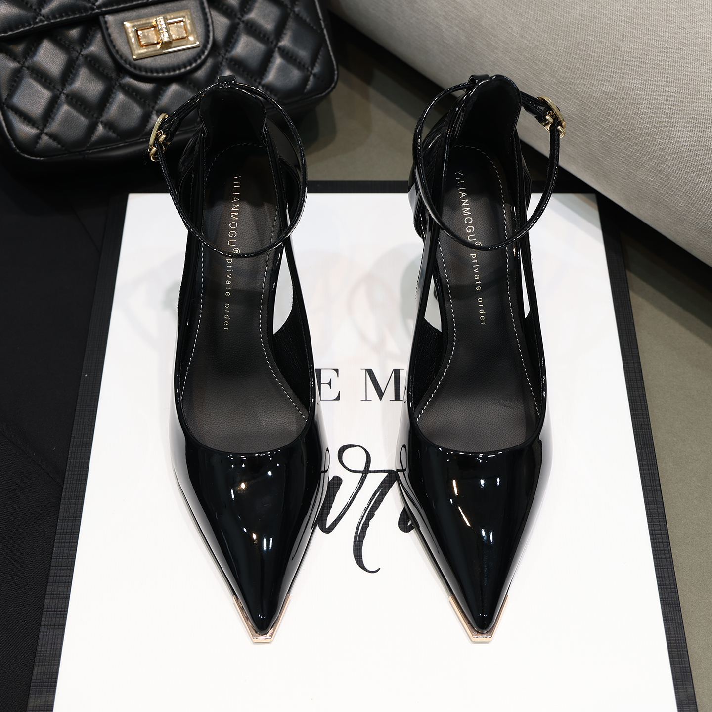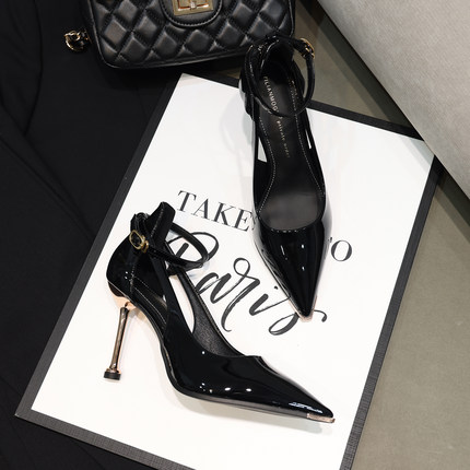 2025新款欧美性感漆皮百搭镂空一字带黑色尖头细跟高跟鞋女鞋单鞋